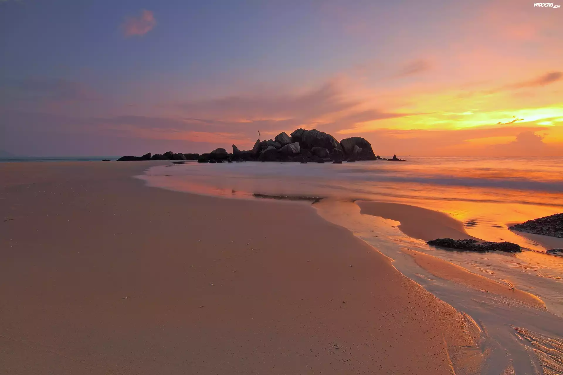 Zdjęcia, Morze, Plaża, Skały, Zachód Słońca