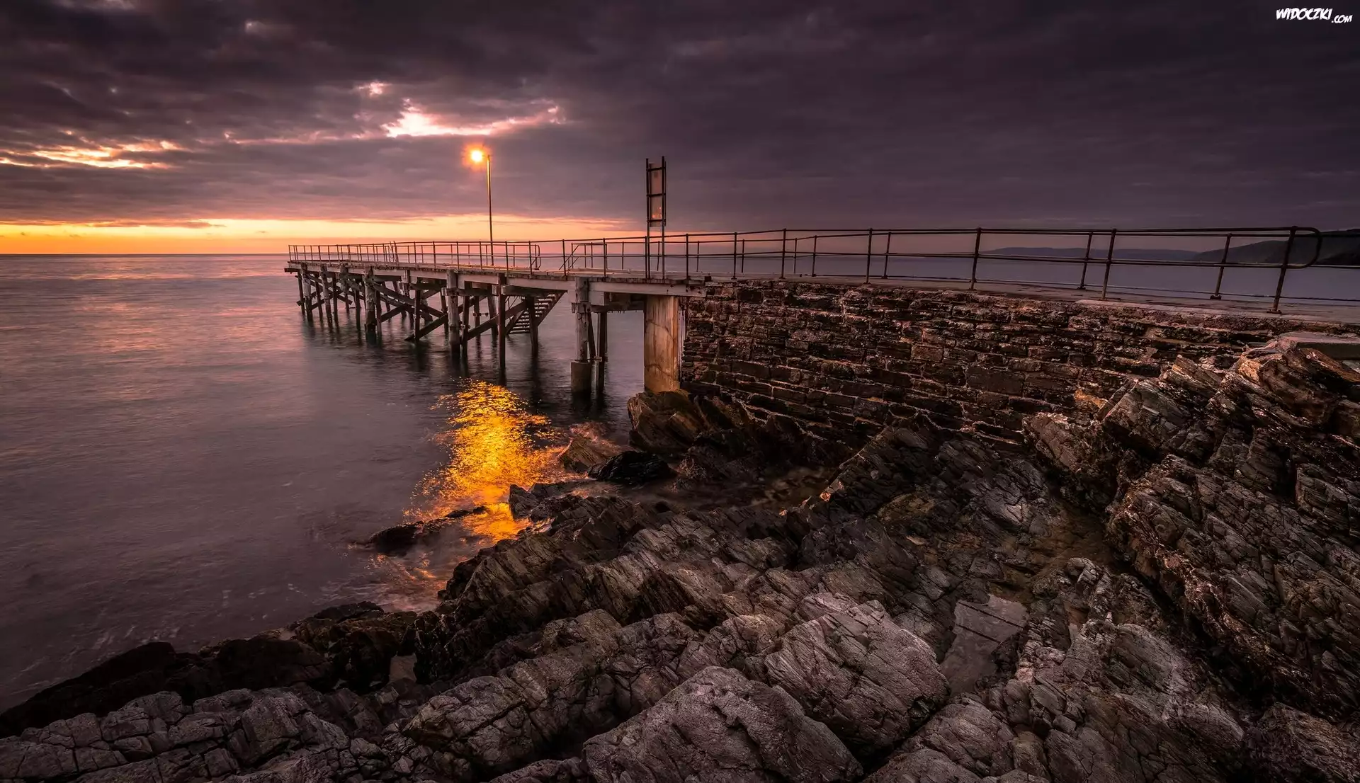 Zdjęcia, Morze, Molo, Skały, Zmrok, Zachód słońca