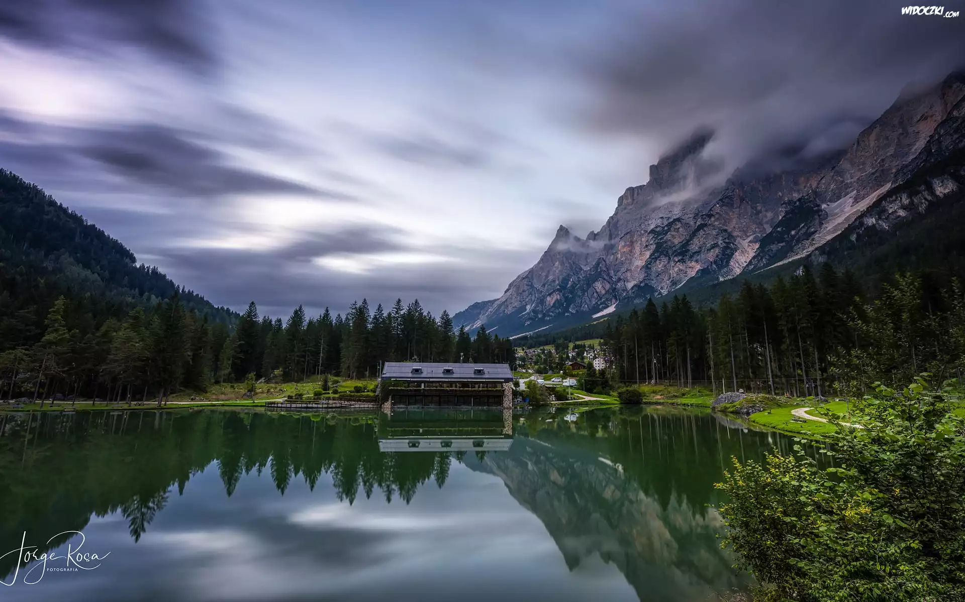 Zdjęcia, Włochy, Prowincja Belluno, Góry, Jezioro, Lago Mosigo, Las, Drzewa, Domy, Odbicie