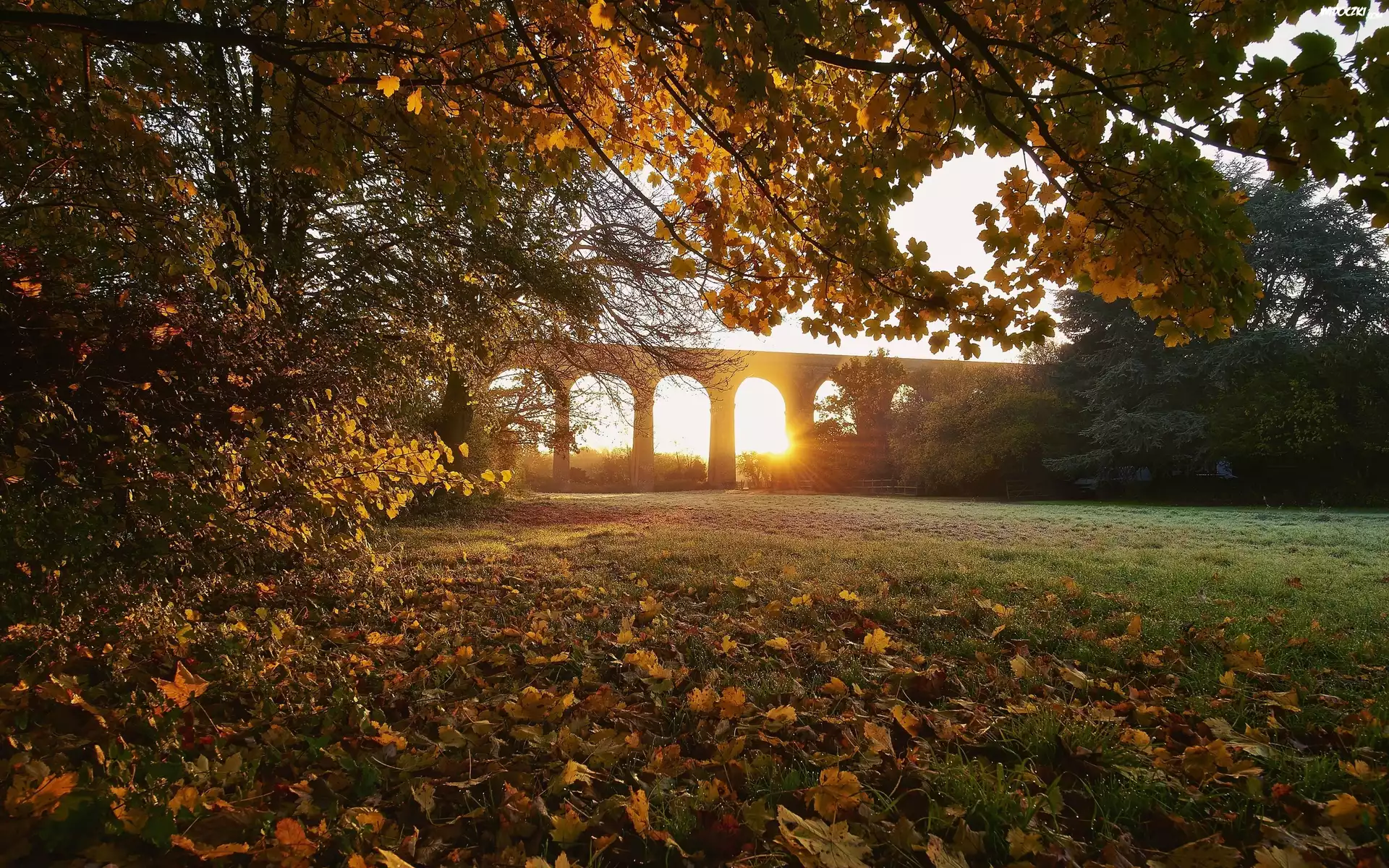 Zdjęcia, Most, Zachód, Słońca, Łąka, Drzewa