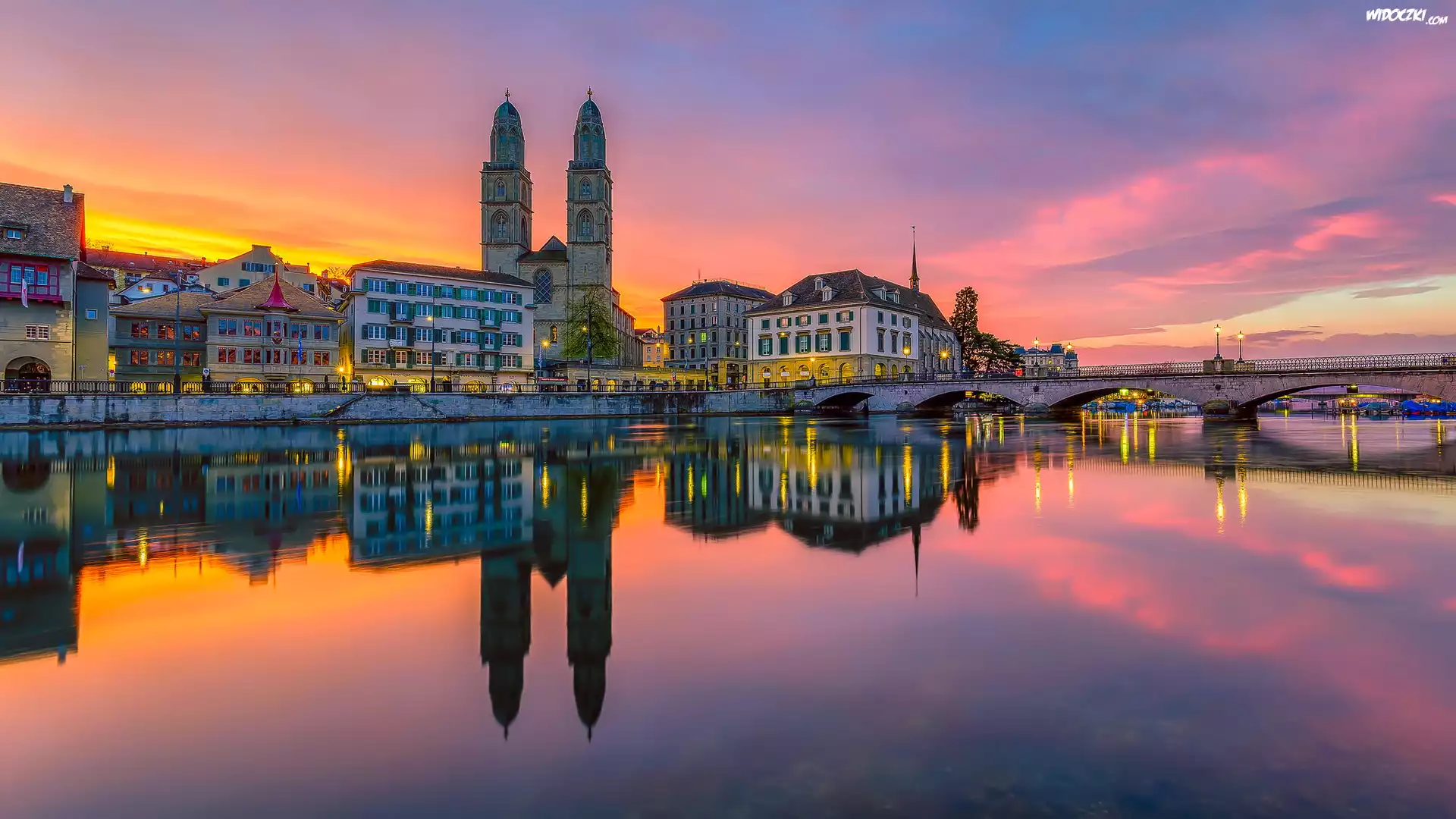 Domy, Wieże, Kościół Grossmunster, Most, Rzeka Limmat, Ulica Limmatquai, Wschód słońca, Zurych, Szwajcaria Zurych |