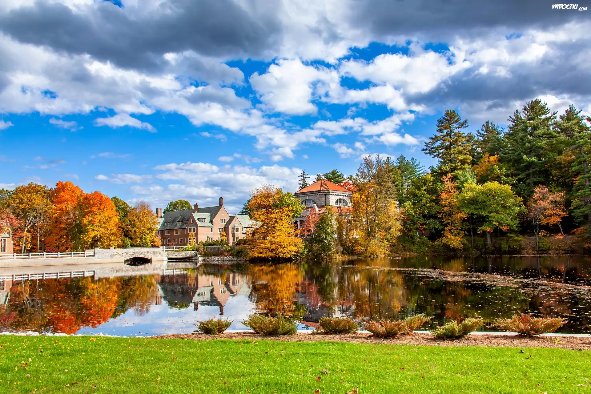 Zdjęcia, Staw, Most, Domy, Drzewa, Jesień