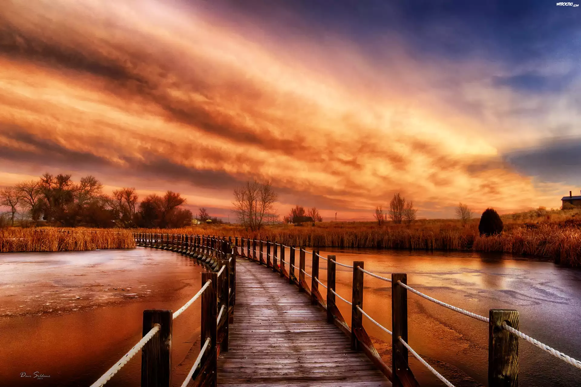 Zdj臋cia, Most, Trzcina, Drzewa, Staw