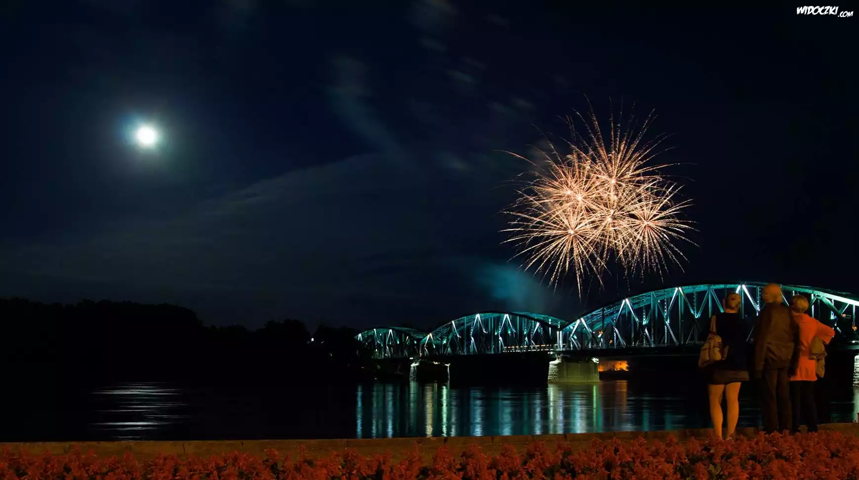 Zdjęcia, Most, Rzeka, Fajerwerki, Ludzie
