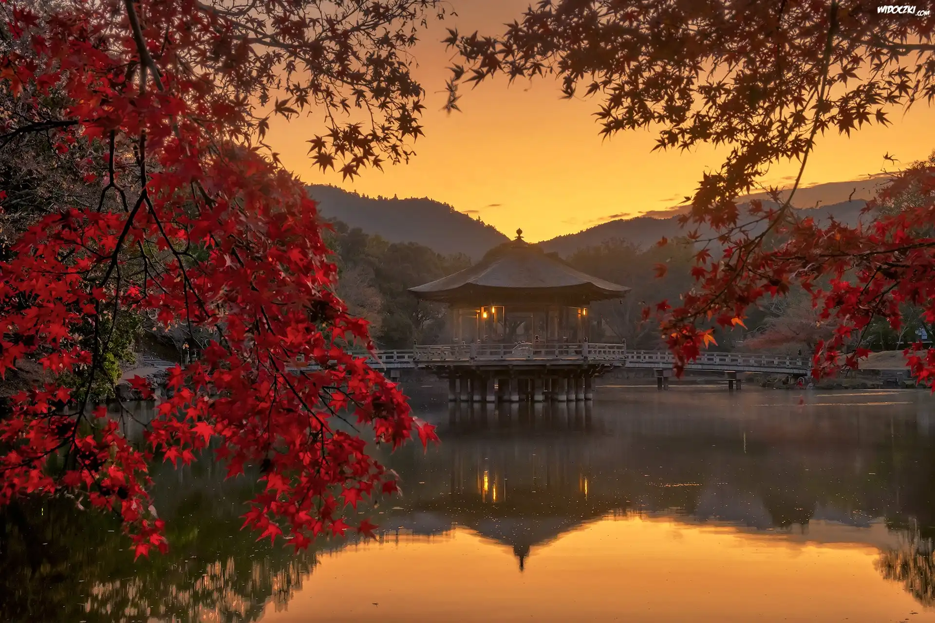 Jesień, Staw, Sagiike, Gałęzie, Most, Altana, Pawilon Ukimido, Zachód słońca, Nara Park, Nara, Japonia |