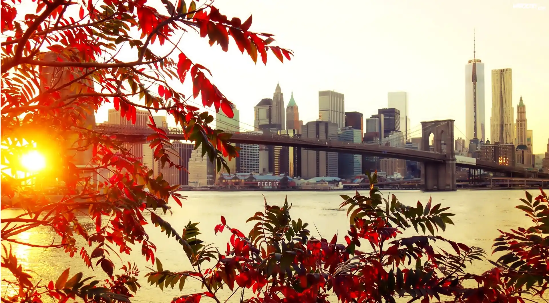 Zdjęcia, Most, Rzeka, Wieżowce, Jesienne, Liście