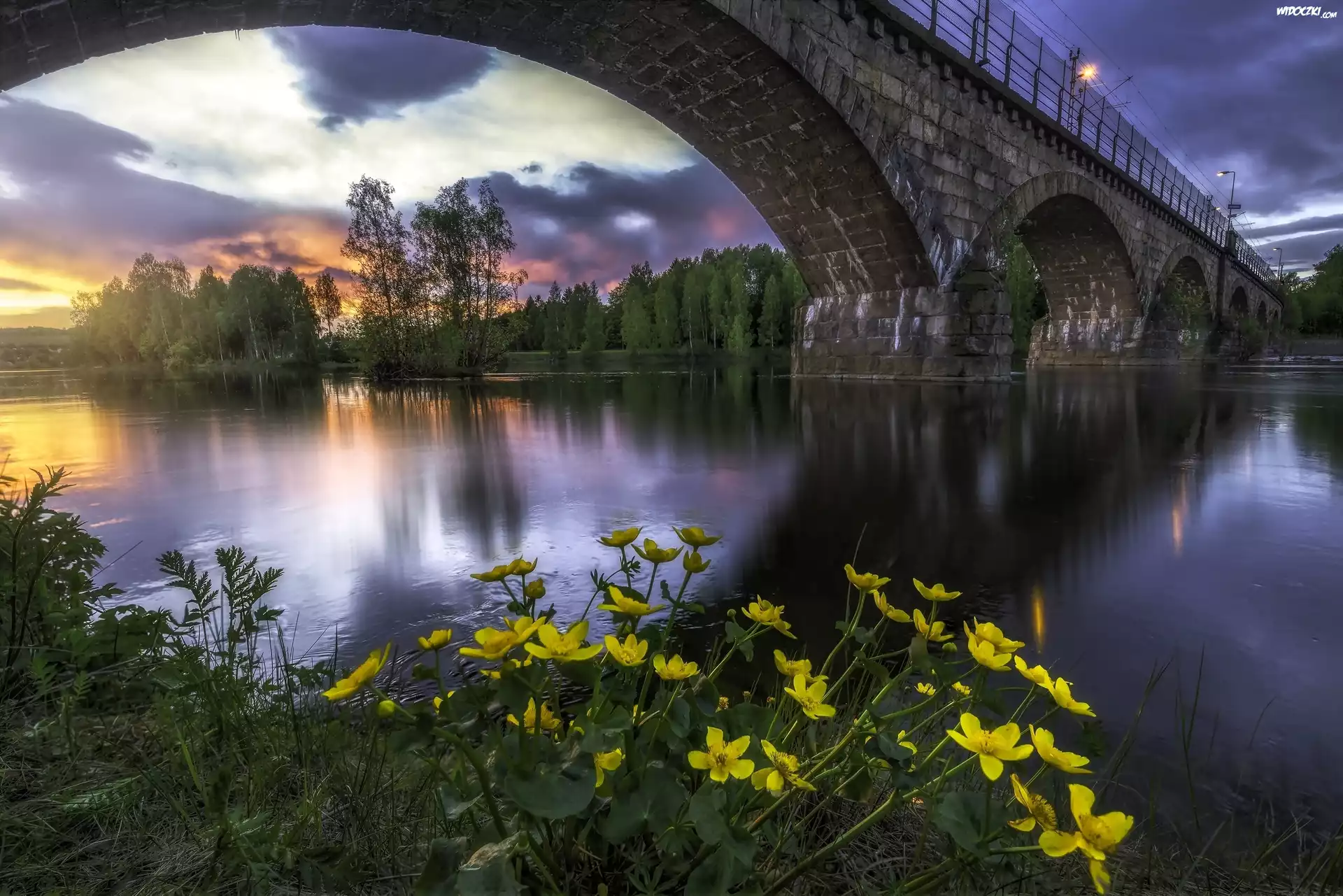 Zdjęcia, Most, Rzeka, Zachód Słońca, Kwiaty, Drzewa