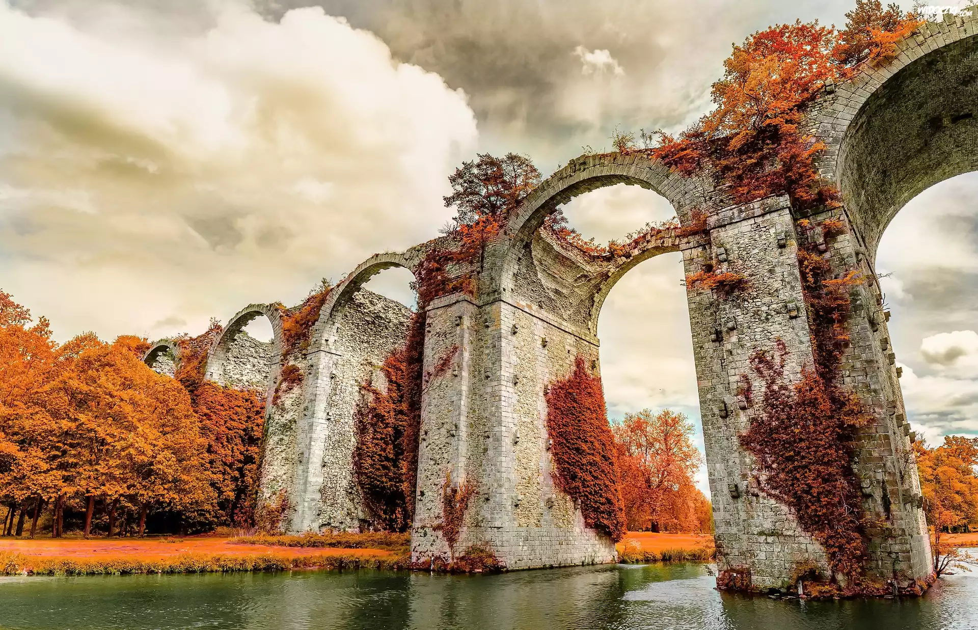 Francja, Akwedukt Maintenon, Most, Drzewa, Jesień, Zabytek