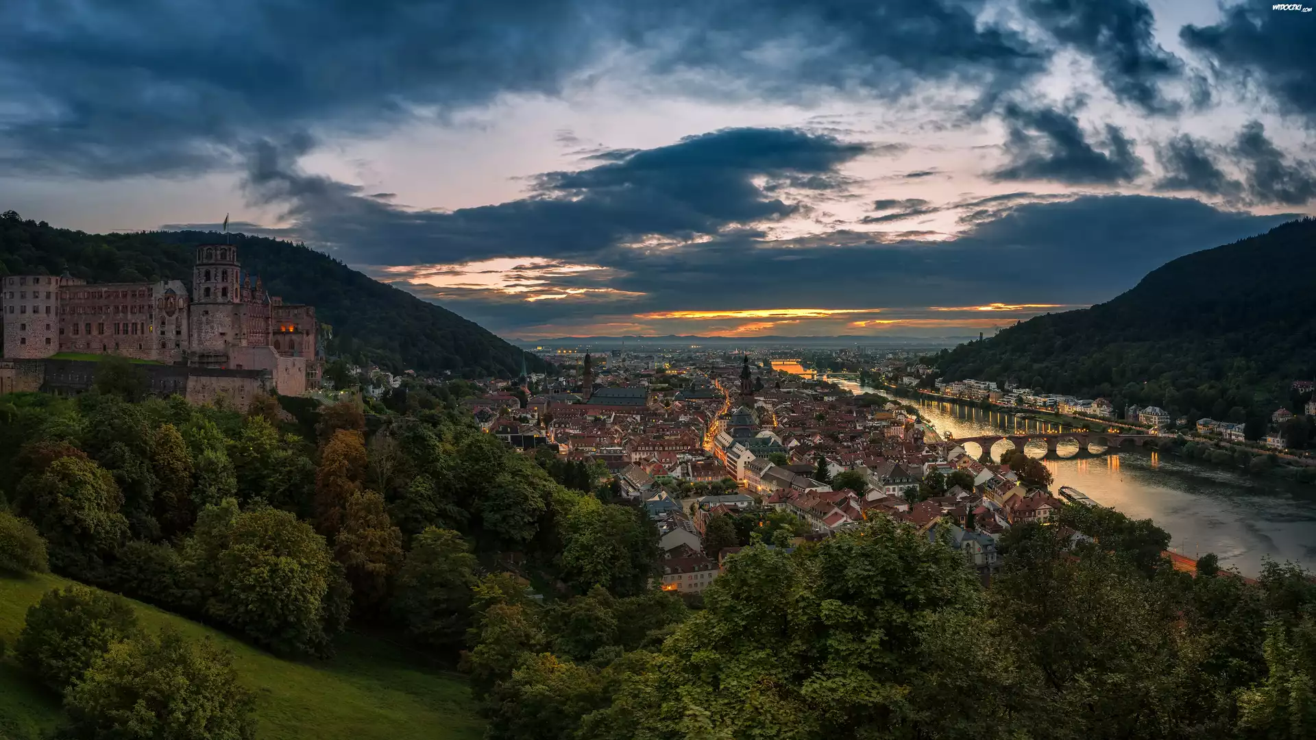 Niemcy, Heidelberg, Góry, Rzeka Neckar, Most, Wzgórze, Ruiny, Zamku, Drzewa, Domy, Chmury