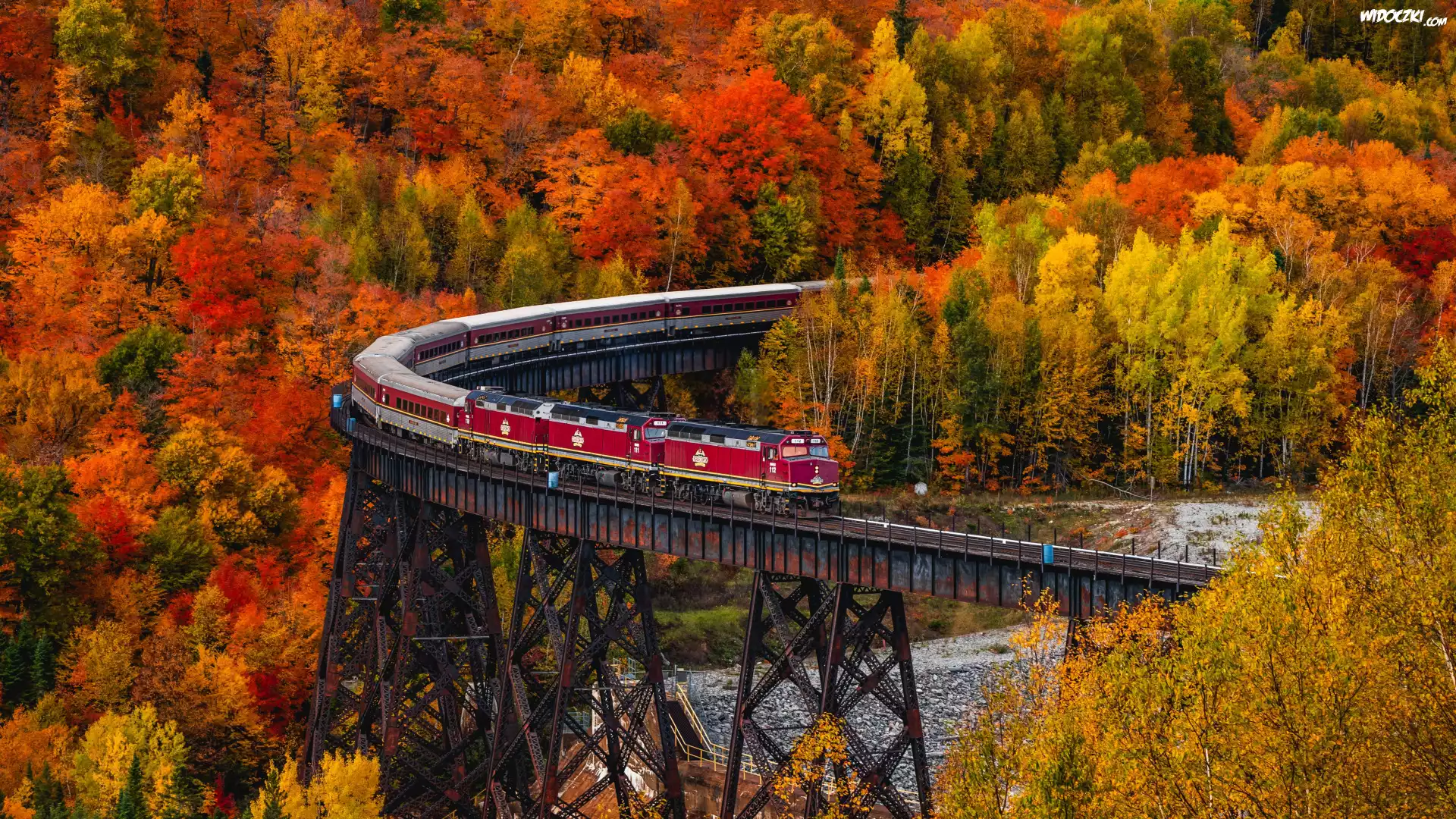 Zdjęcia, Jesień, Most, Pociąg, Las, Drzewa