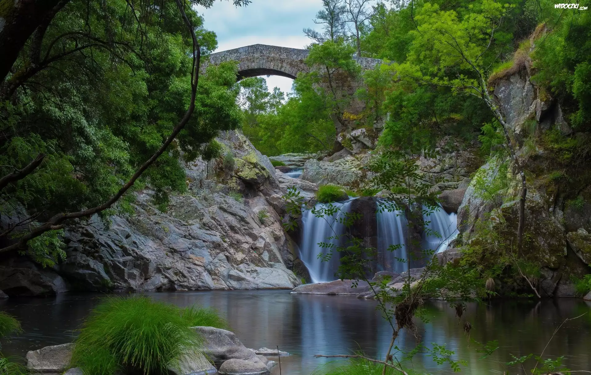 Most rzymski, Eira Queimada, Tarouca, Viseu, Portugalia, Skały, Drzewa, Mały, Wodospad, Rzeka Varosa River, Trawa |