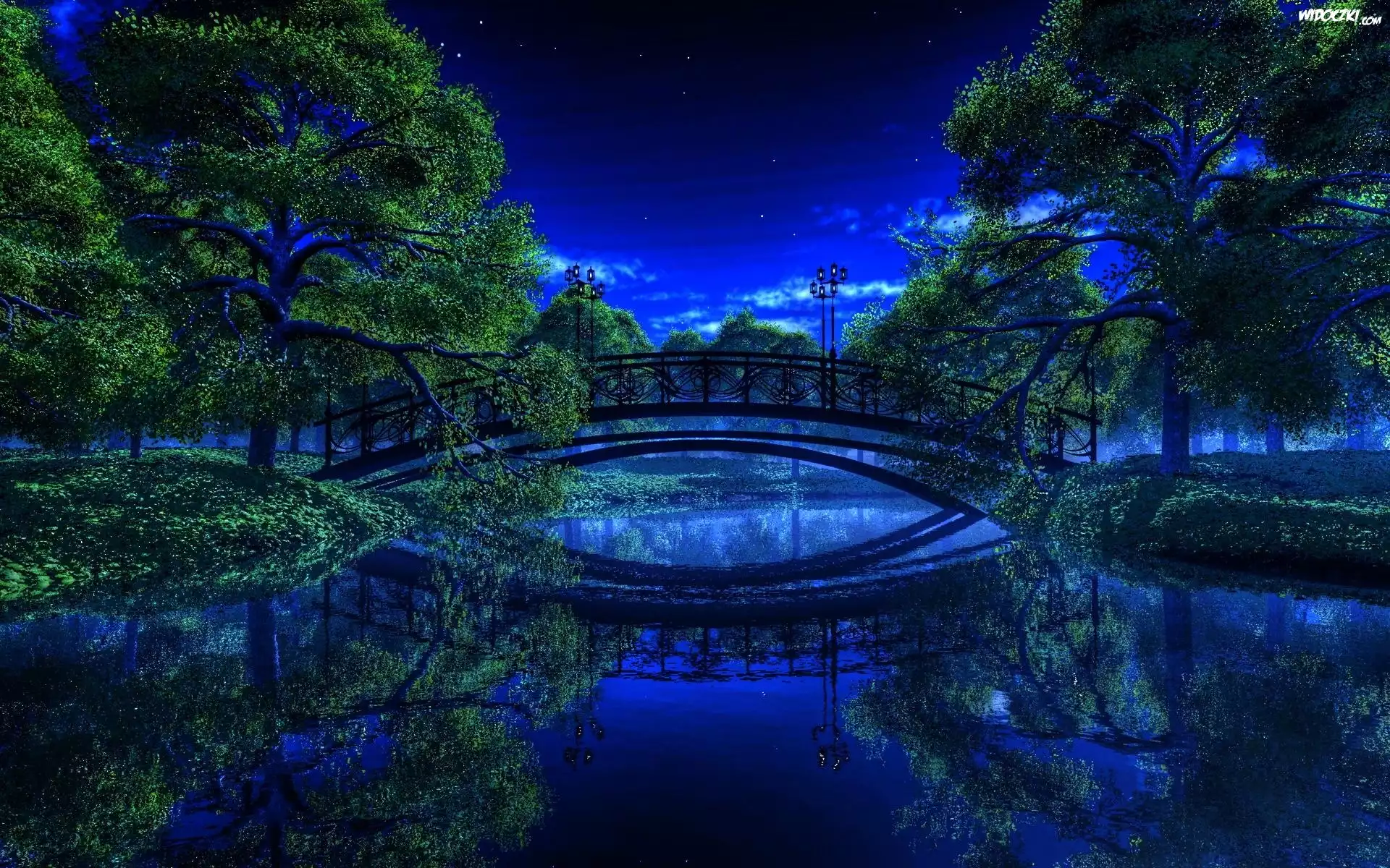 Zdjęcia, Most, Drzewa, Rzeczka, Noc