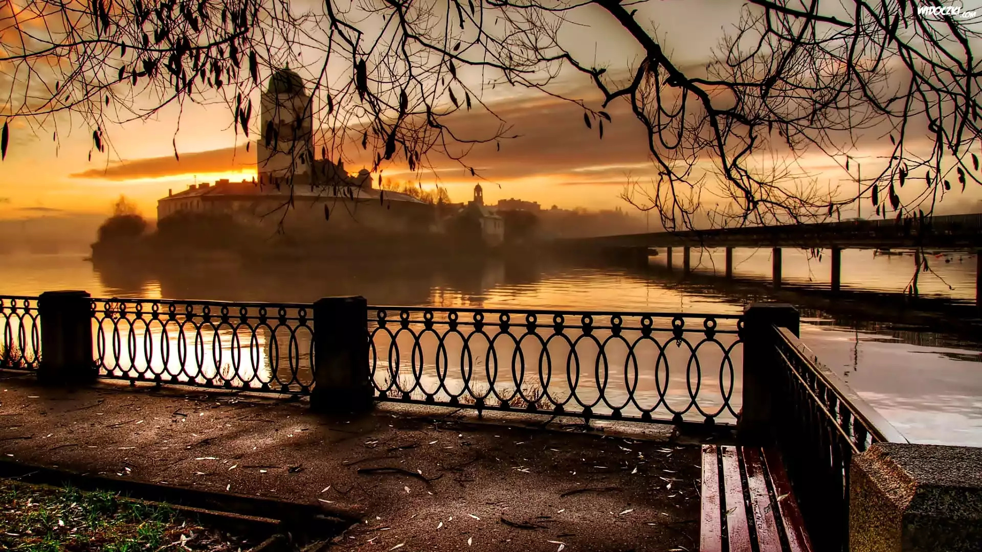 Zdjęcia, Rzeka, Most, Mgła, Zachód, Słońca, Zamek, Balustrada