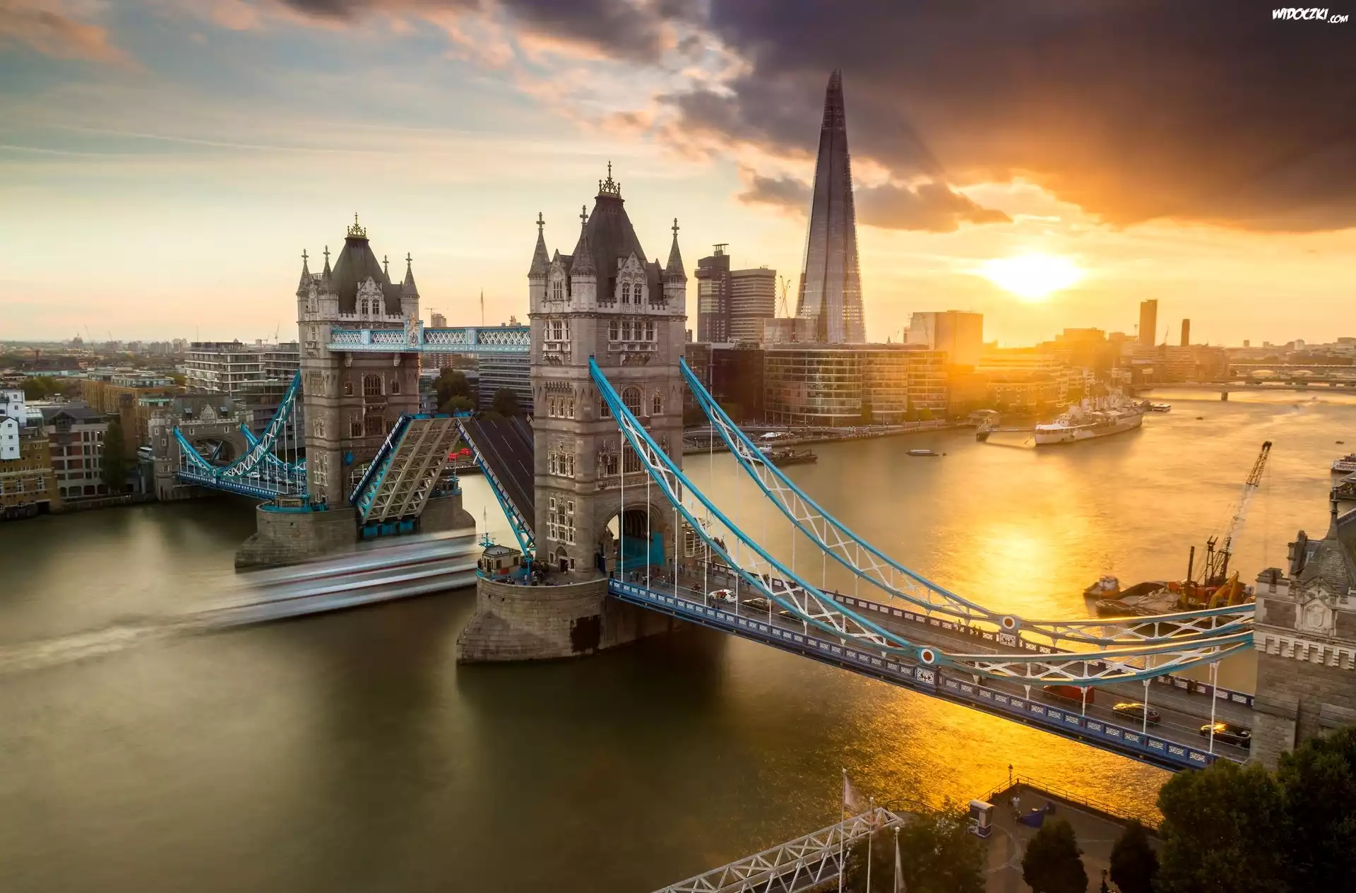 Rzeka, Most, Statki, Wschód, Słońca, Tower Bridge