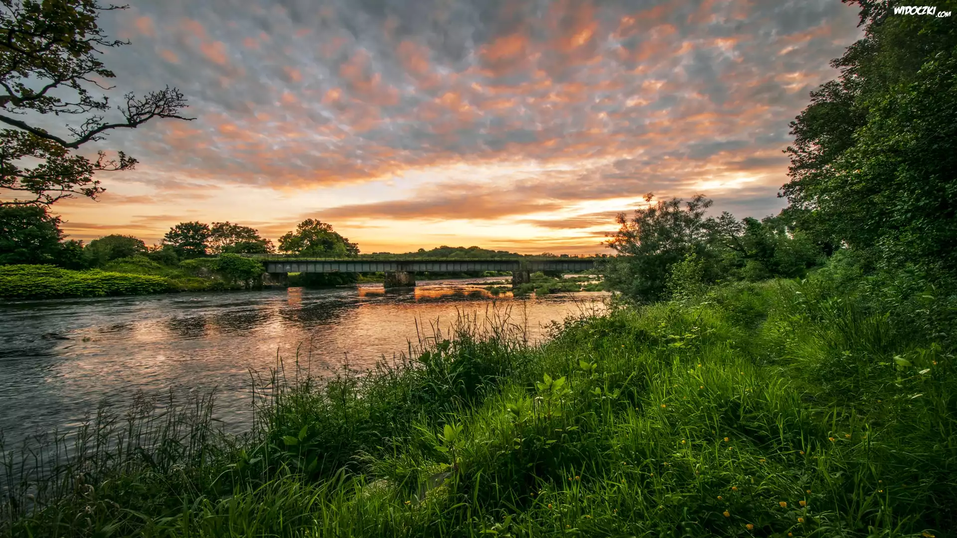 Rzeka, Most, Drzewa, Roślinność, Zachód słońca, Chmury