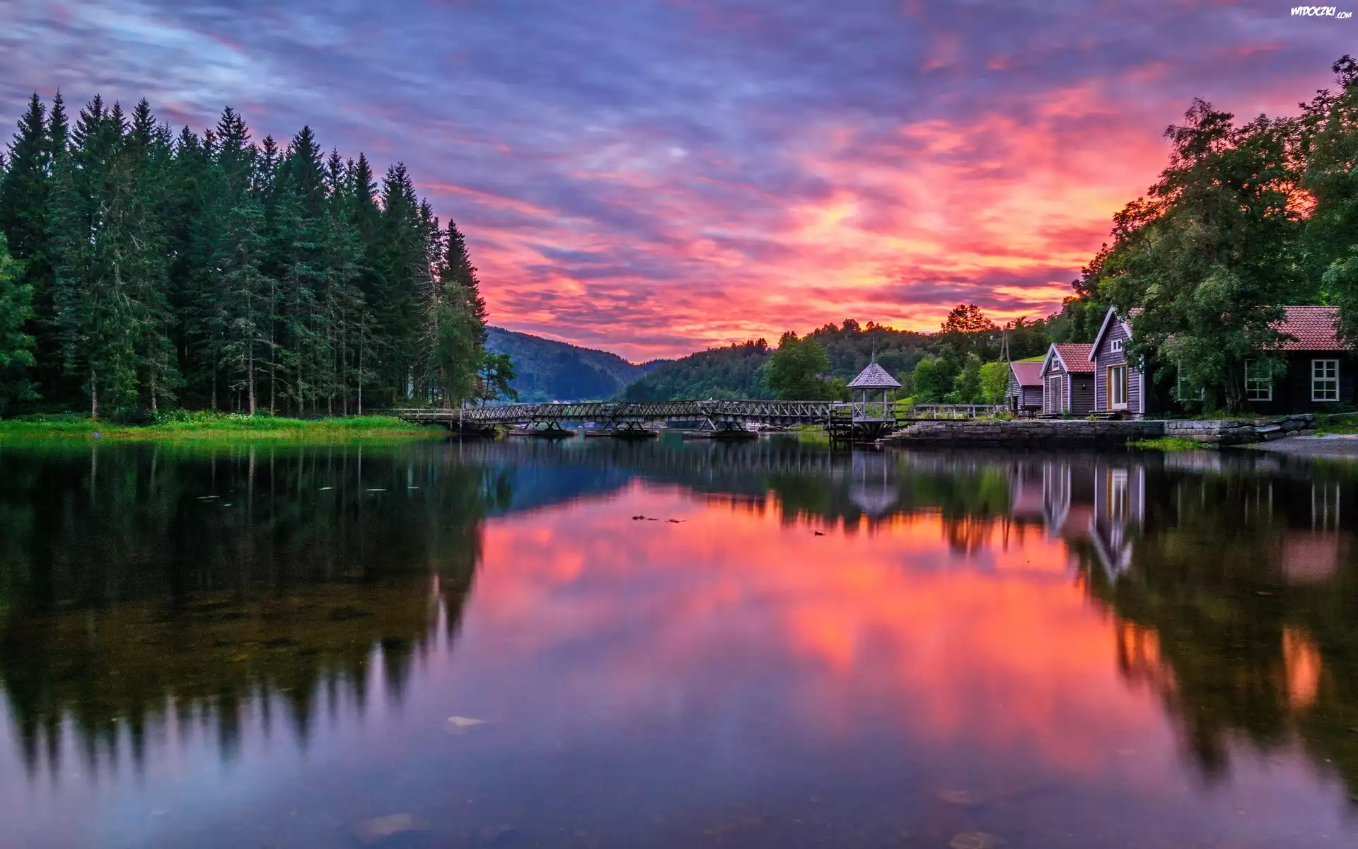 Zdjęcia, Rzeka, Most, Domy, Lasy, Góry, Zachód, Słońca