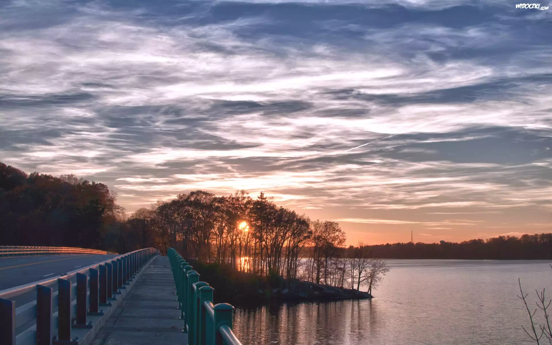 Zdjęcia, Most, Jezioro, Zachód Słońca, Drzewa