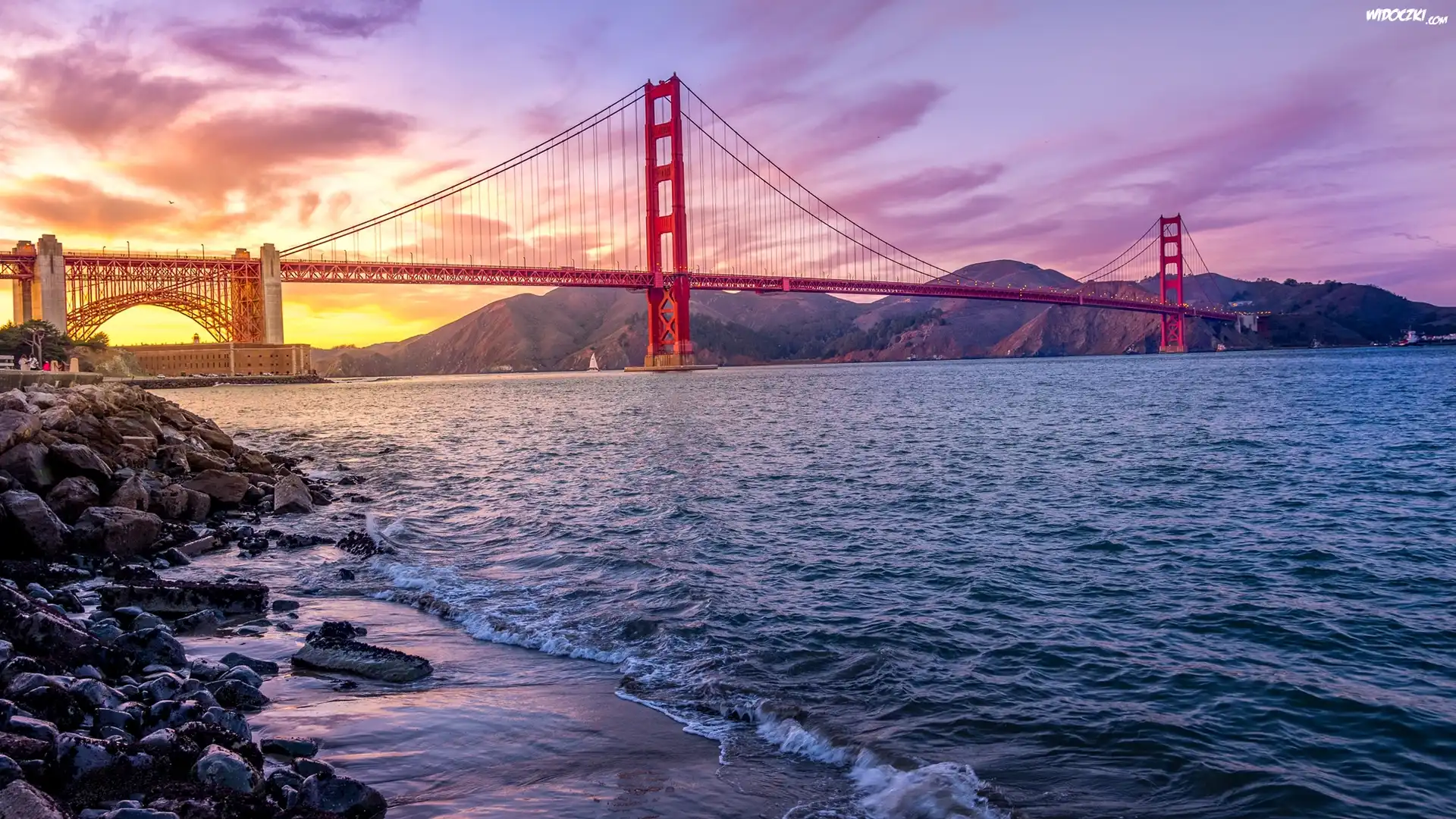 Stany Zjednoczone, Stan Kalifornia, Most Golden Gate Bridge, Cieśnina Golden Gate, Zachód słońca, Kamienie |