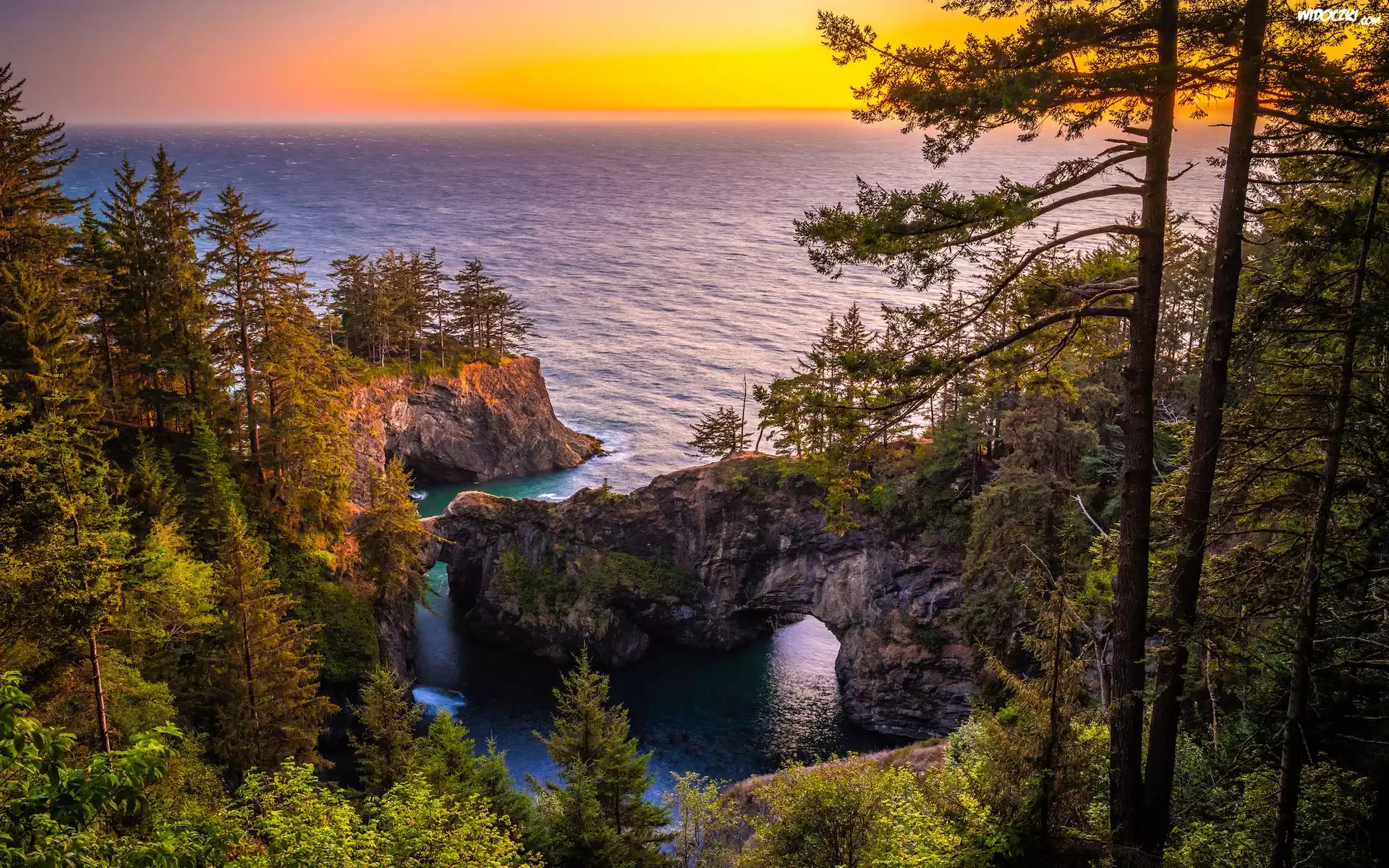 Skały, Most skalny, Drzewa, Morze, Wybrzeże Park stanowy, Samuel H. Boardman State Scenic Corridor, Punkt widokowy, Natural Bridges Viewpoint, Brookings, Oregon, Stany Zjednoczone |