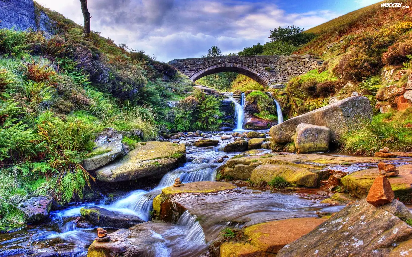Zdjęcia, Most, Rzeczka, Kamienie, Wodospad, Krzewy
