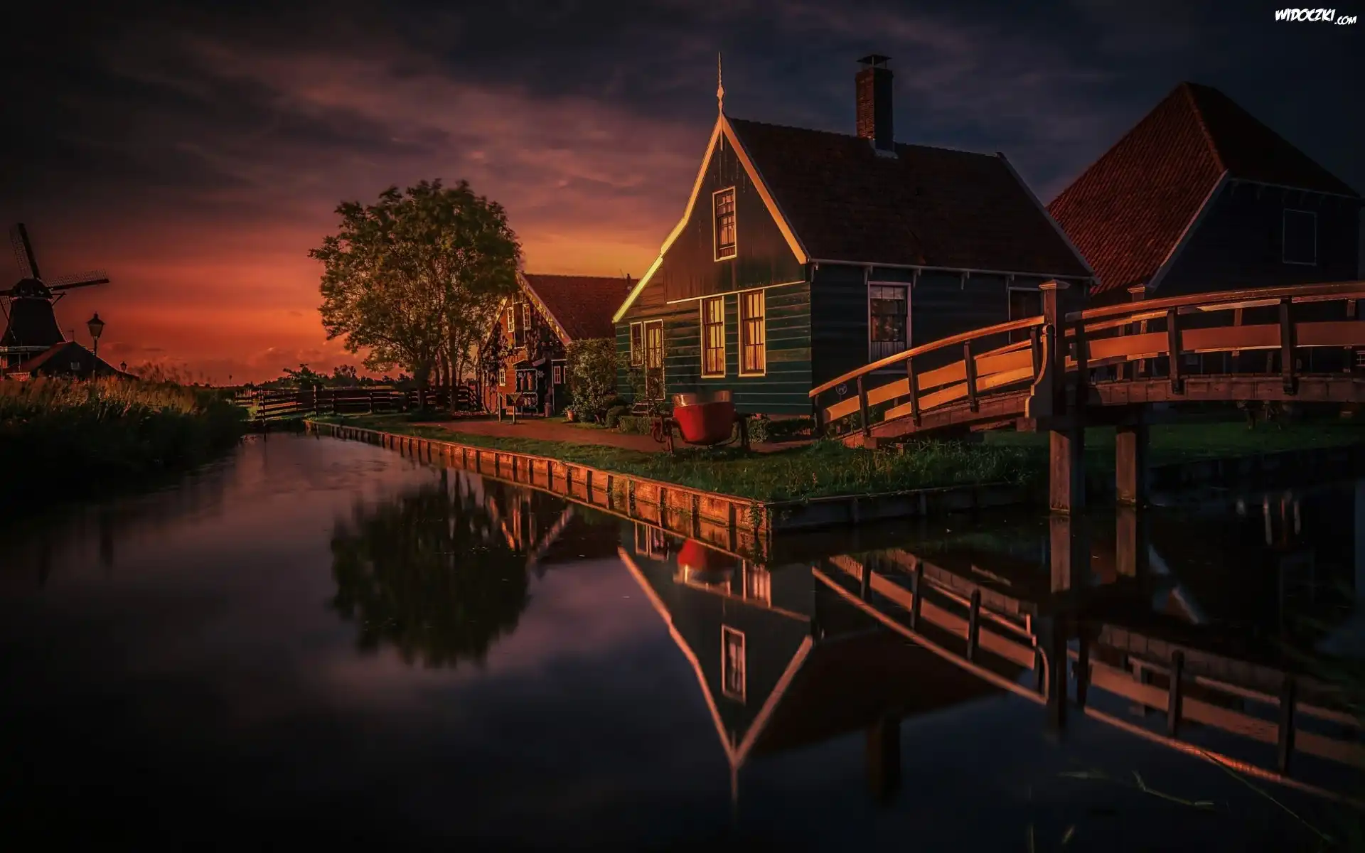 Zdjęcia, Holandia, Skansen Zaanse Schans, Domy, Rzeka, Zachód słońca, Most