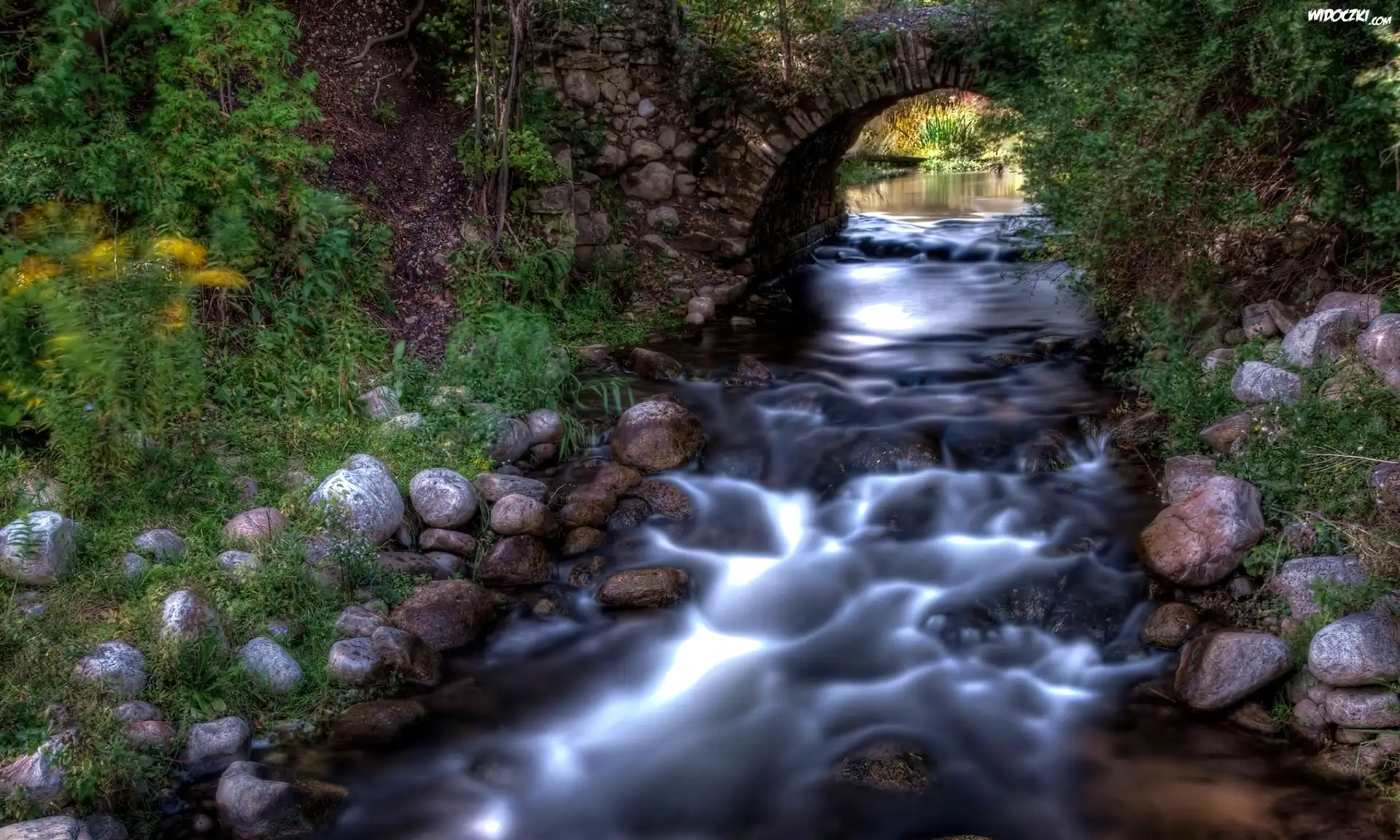 Zdjęcia, Mostek, Strumyk, Kamienie, Zarośła