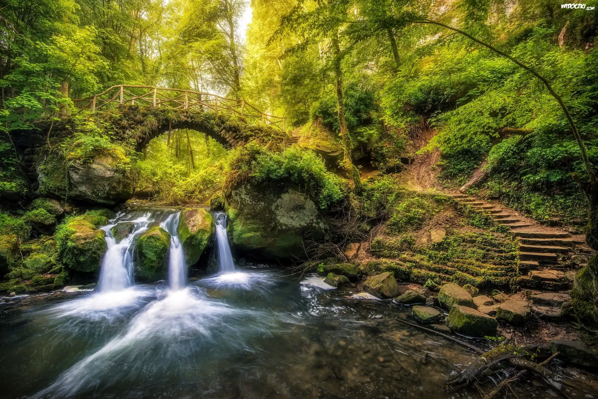 Zdjęcia, Mostek, Wodospad, Las, Schodki