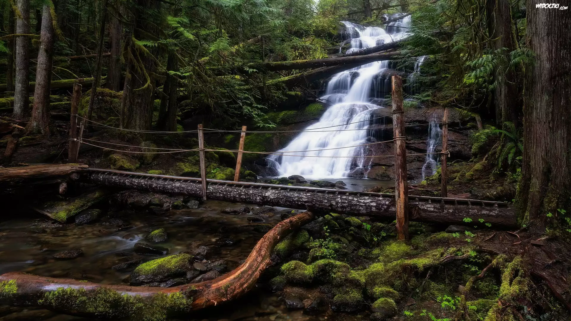 Zdjęcia, Las, Skały, Wodospad, Mostek