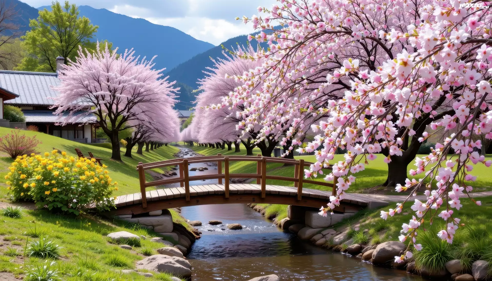 Zdjęcia, Wiosna, Kwitnace, Drzewa, Mostek, Kwiaty, Rzeka