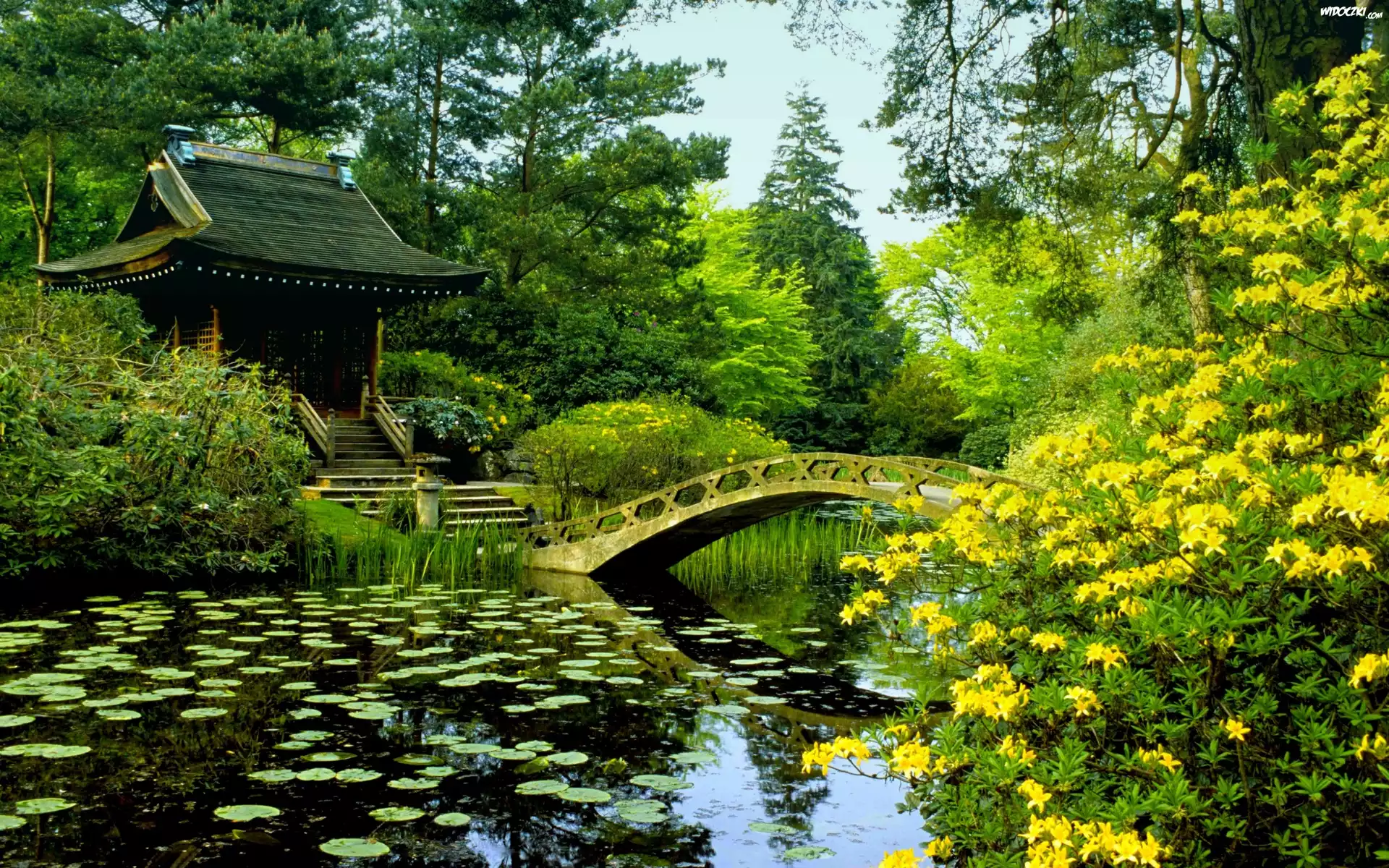 Park, Mostek, Altanka, Krzewy, Lilie wodne, Wiosna, Staw