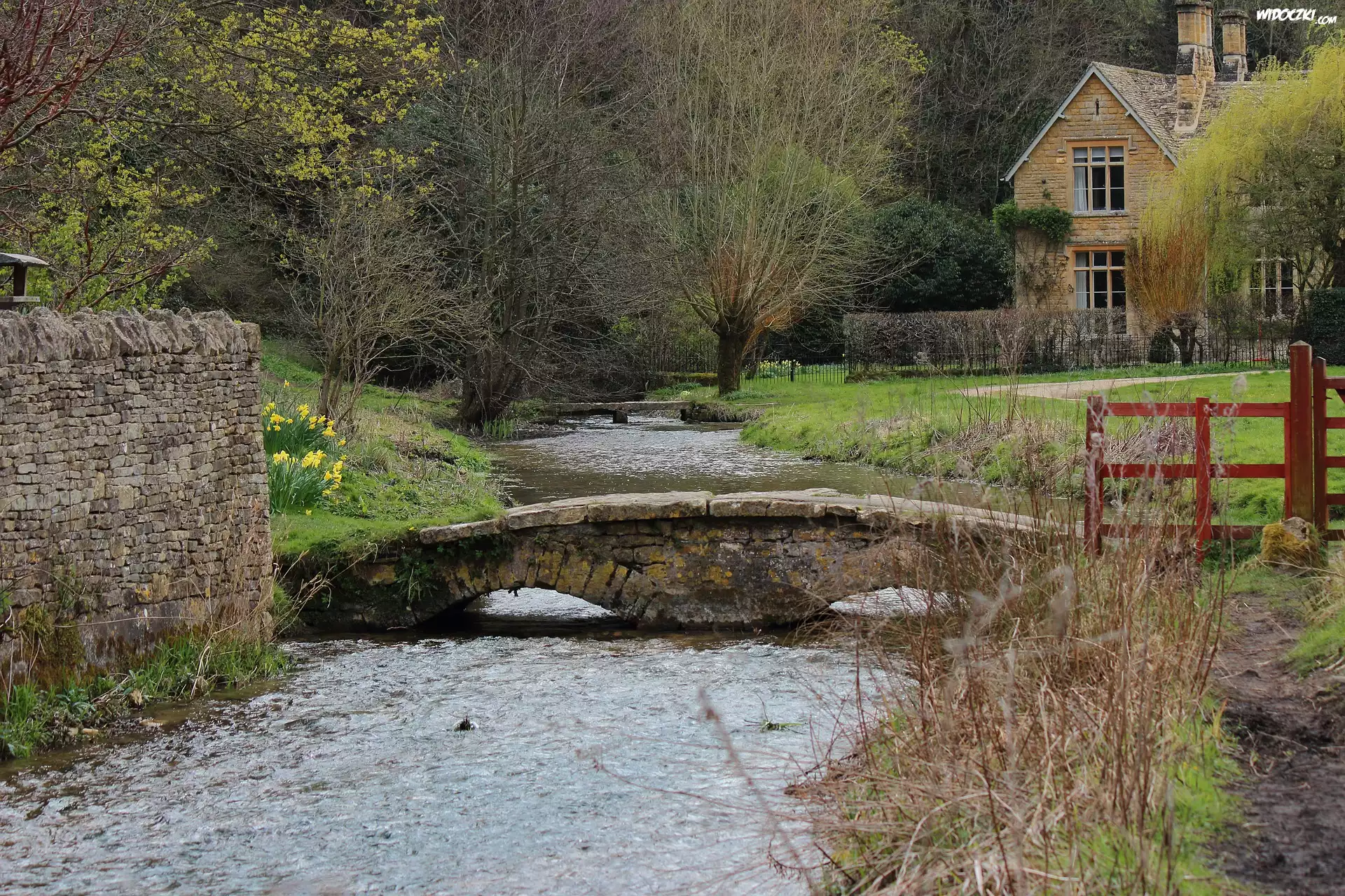 Zdjęcia, Rzeka, Mostki, Dom, Drzewa, Wiosna
