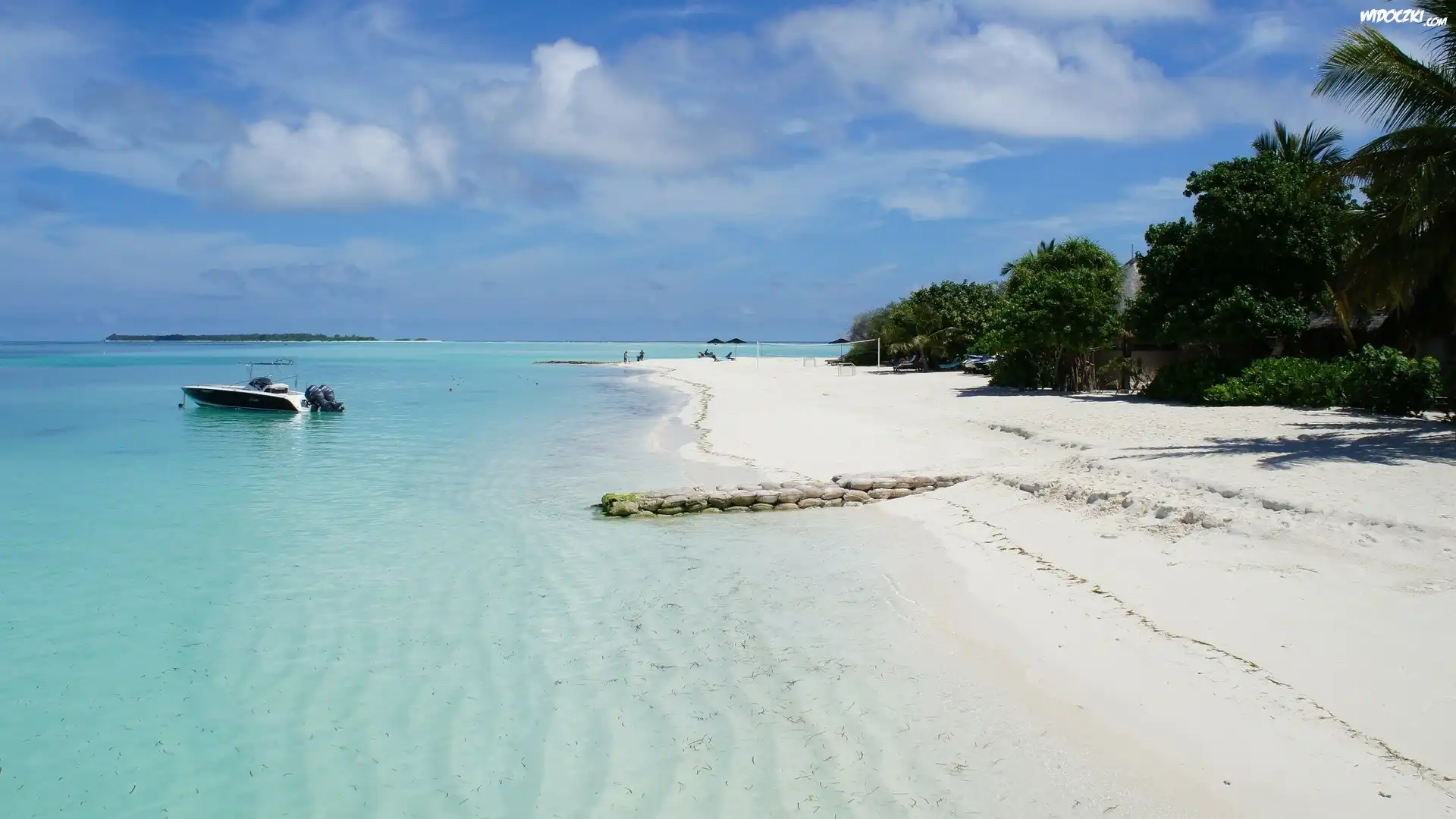 Zdjęcia, Morze, Motorówka, Drzewa, Palmy, Plaża