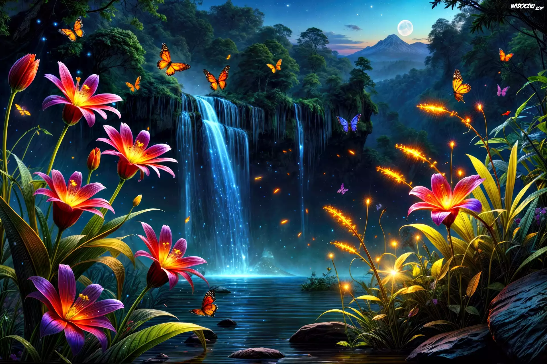 Zdjęcia, Kwiaty, Motyle, Wodospad, Drzewa, Grafika