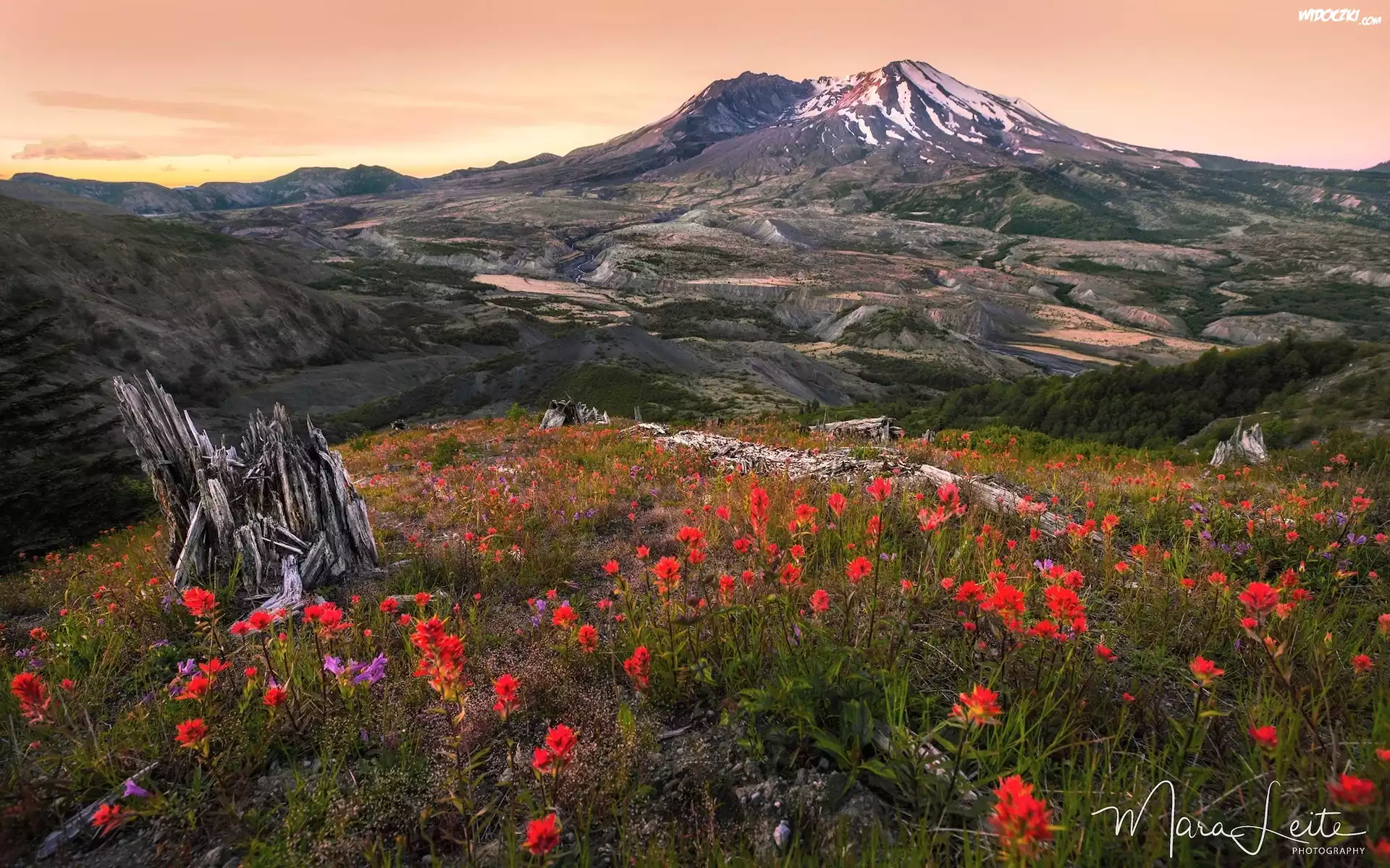 Góry Kaskadowe, Góra, Wulkan, Mount St Helens, Łąka, Kwiaty, Konar, Stan Waszyngton, Stany Zjednoczone |