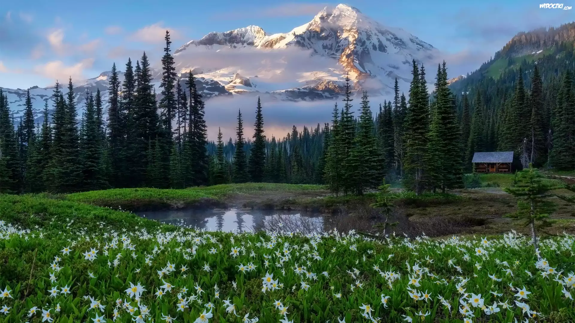 Kwiaty, Lilie lawinowe, Staw, Góry, Drzewa, Park Narodowy Mount Rainier, Stan Waszyngton, Stany Zjednoczone |