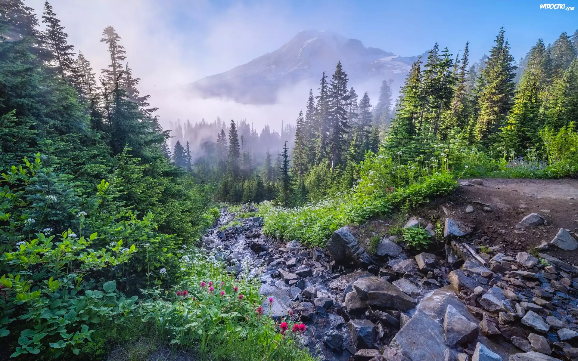 Stany Zjednoczone, Waszyngton, Park Narodowy Mount Rainier, Góra, Mount Rainier, Mgła, Drzewa, Kamienie, Kwiaty |
