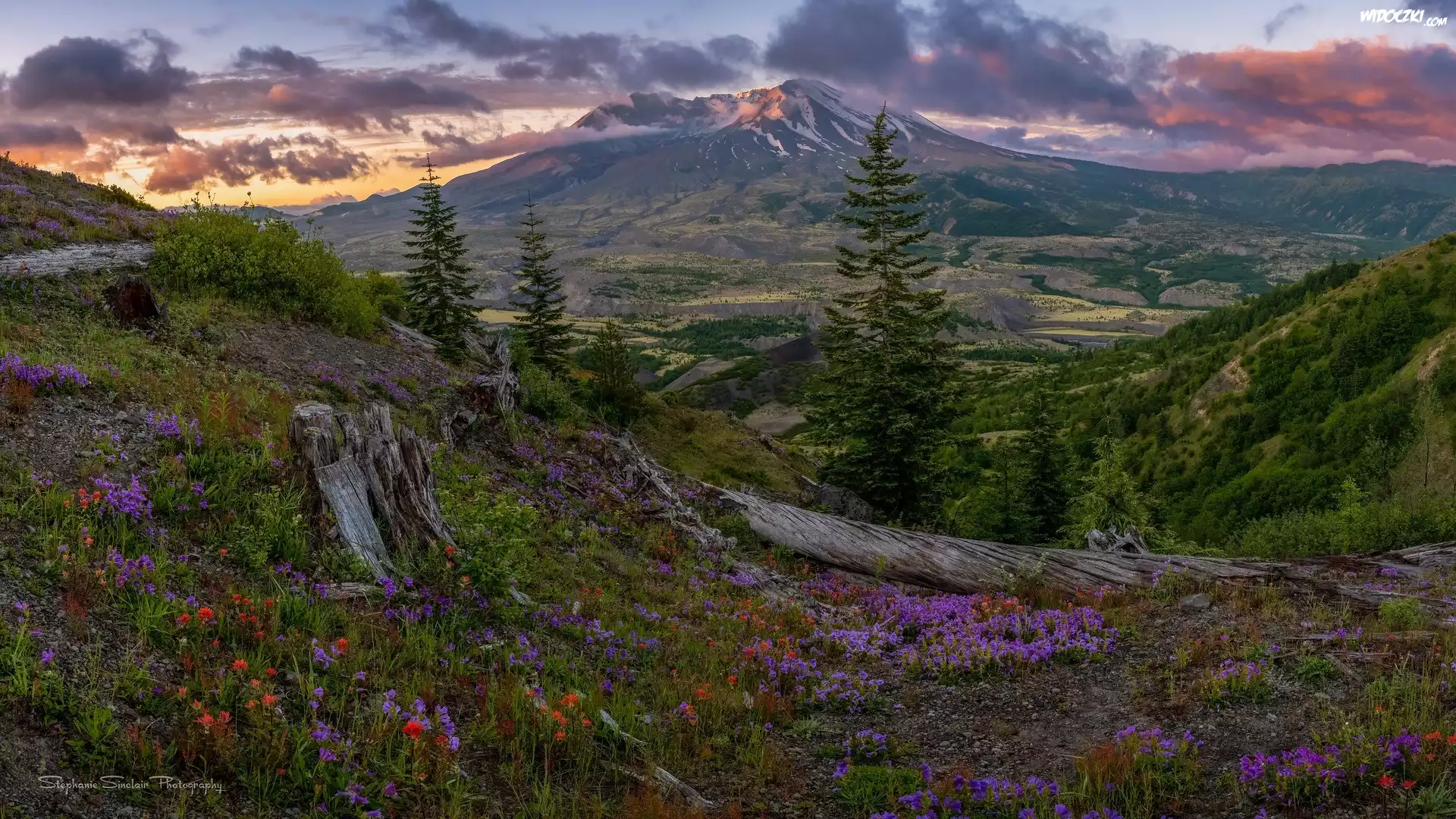Góry Kaskadowe, Stratowulkan, Mount St Helens, Łąka, Kwiaty, Drzewa, Stan Waszyngton, Stany Zjednoczone |