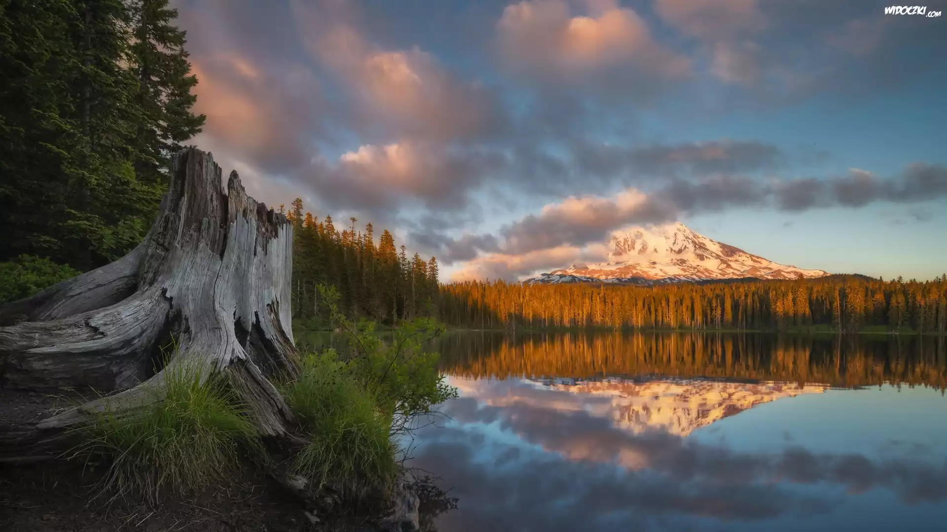 Stany Zjednoczone, Waszyngton, Góra, Stratowulkan, Mount Adams, Jezioro, Takhlakh Lake, Drzewa, Chmury |