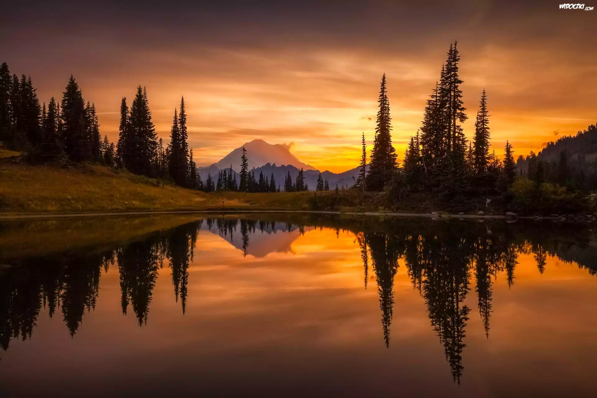 Stany Zjednoczone, Stan Waszyngton, Park Narodowy Mount Rainier Stratowulkan Mount Rainier, Jezioro, Drzewa, Odbicie, Zachód Słońca |