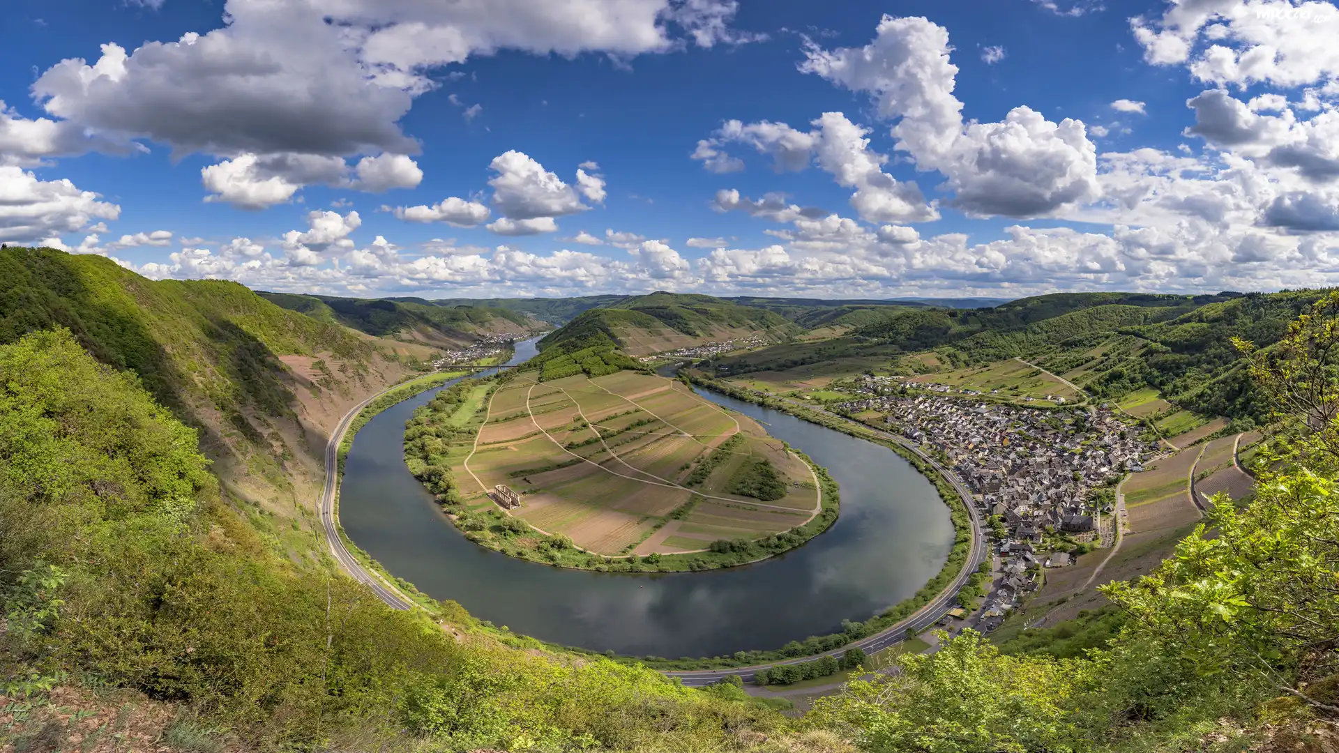 Niemcy, Nadrenia-Palatynat, Rzeka Mozela, Zakole, Dolina Mozeli, Góry, Miejscowość, Bremm, Domy, Drzewa, Chmury |