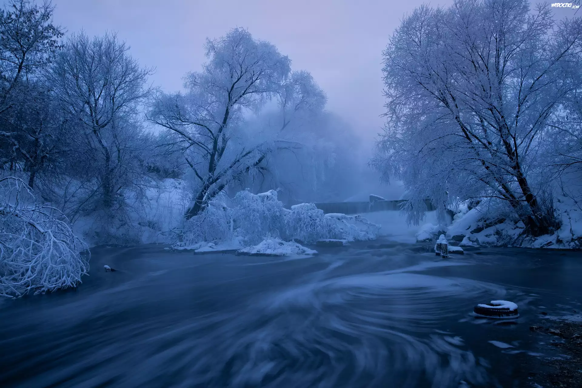 Zima, Mróz, Wodospad, Rzeka, Oszronione, Drzewa, Poranek