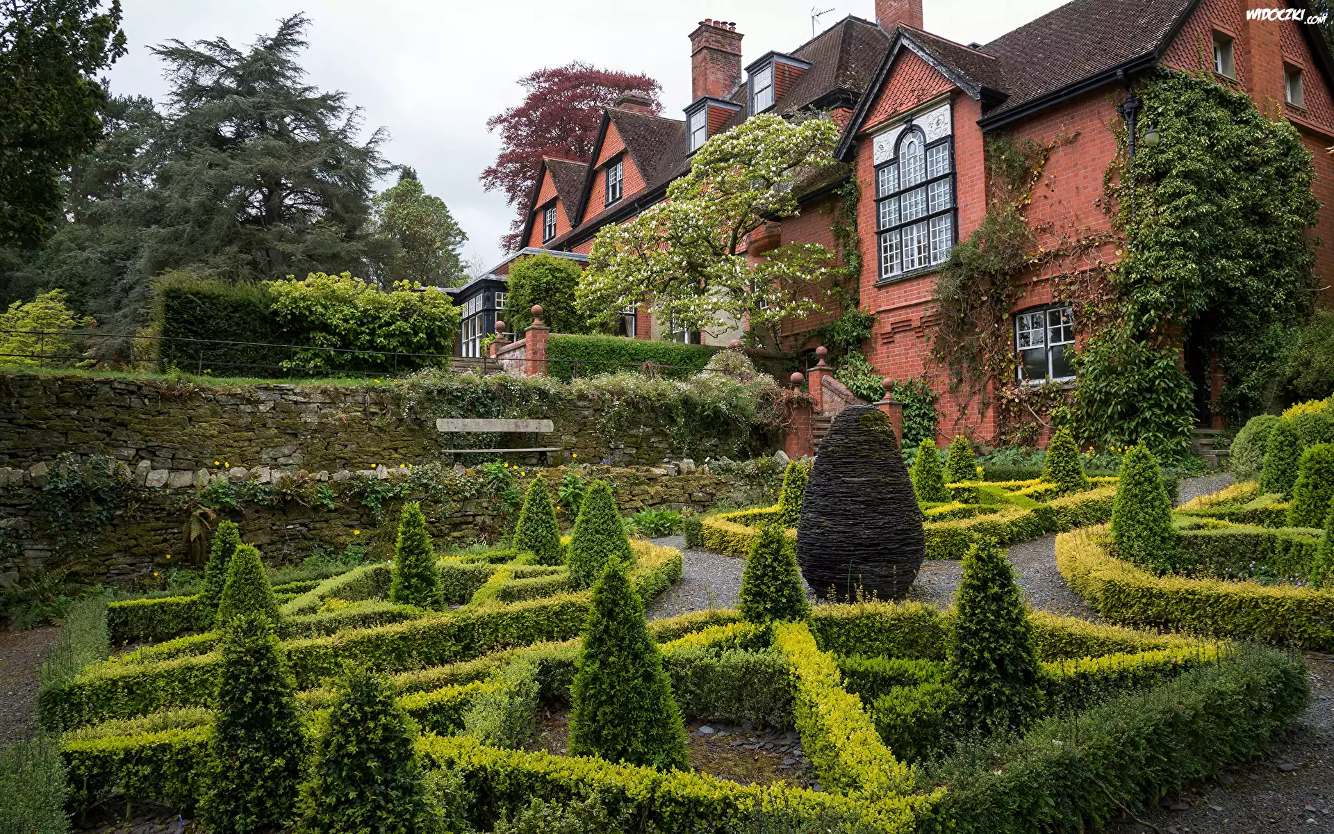 Zdjęcia, Murowany, Dom, Ogród, Hergest Croft Garden, Krzewy, Drzewa, Kington, Anglia