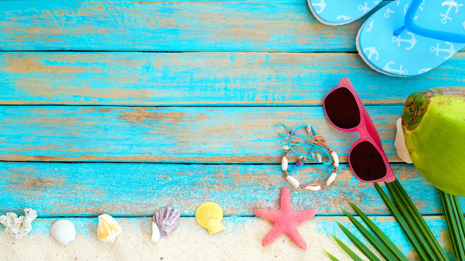 Klapki, Muszelki, Rozgwiazda, Okulary, Kokos, Deski, Wakacje, Lato
