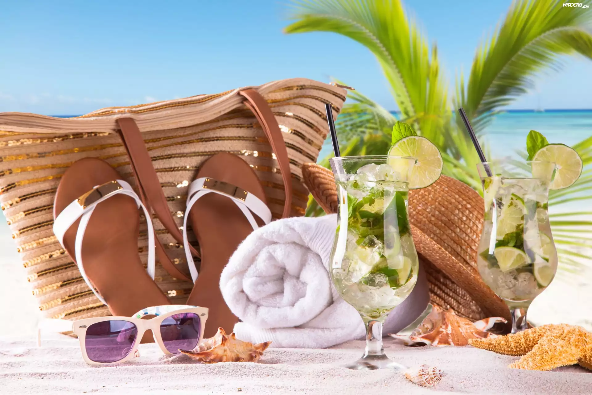 Zdjęcia, Kompozycja, Muszle, Plaża, Palma, Klapki, Okulary, Kapelusz, Wakacje