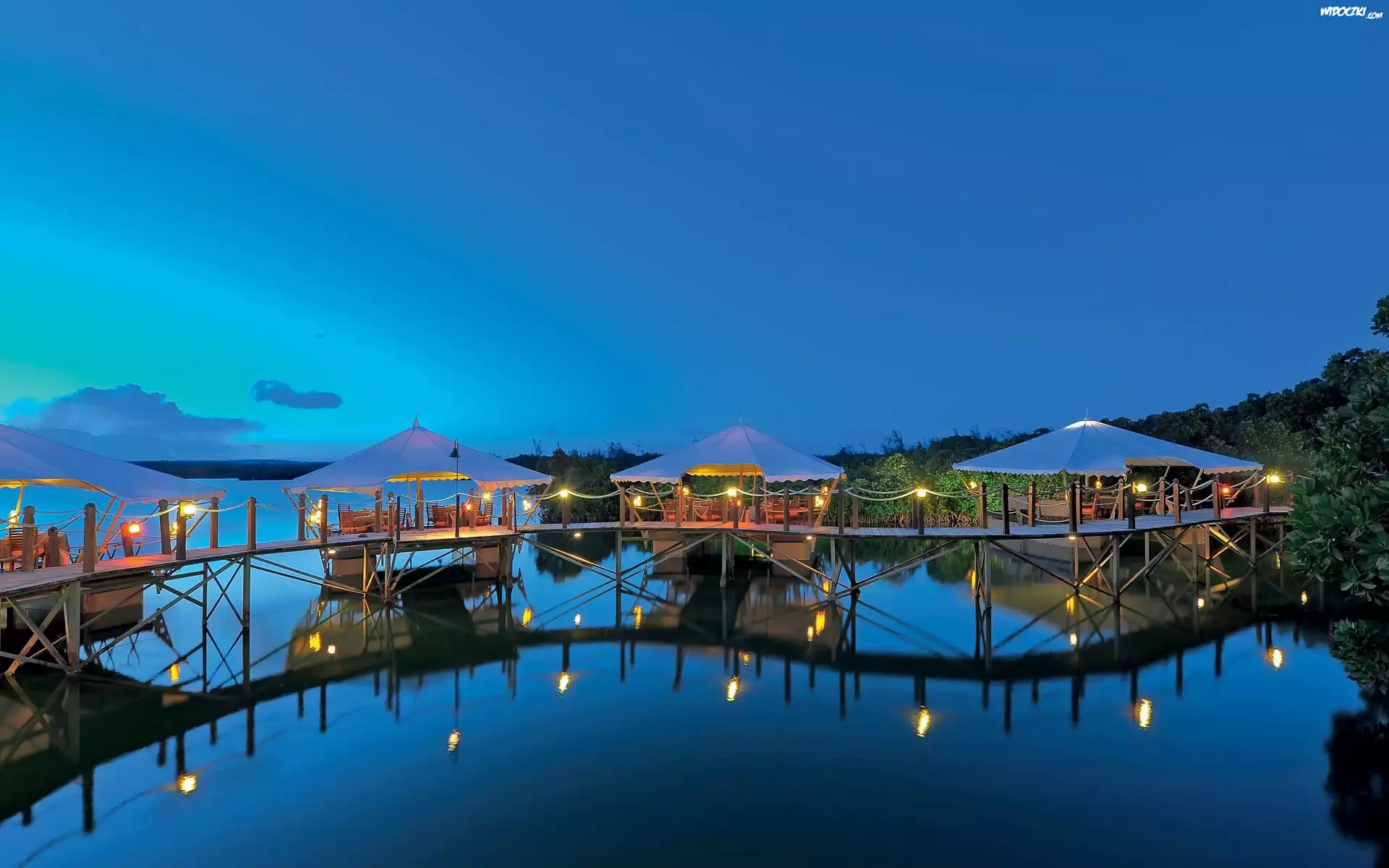 Restauracja, Parasole, Mostek, Oświetlenie, Jezioro