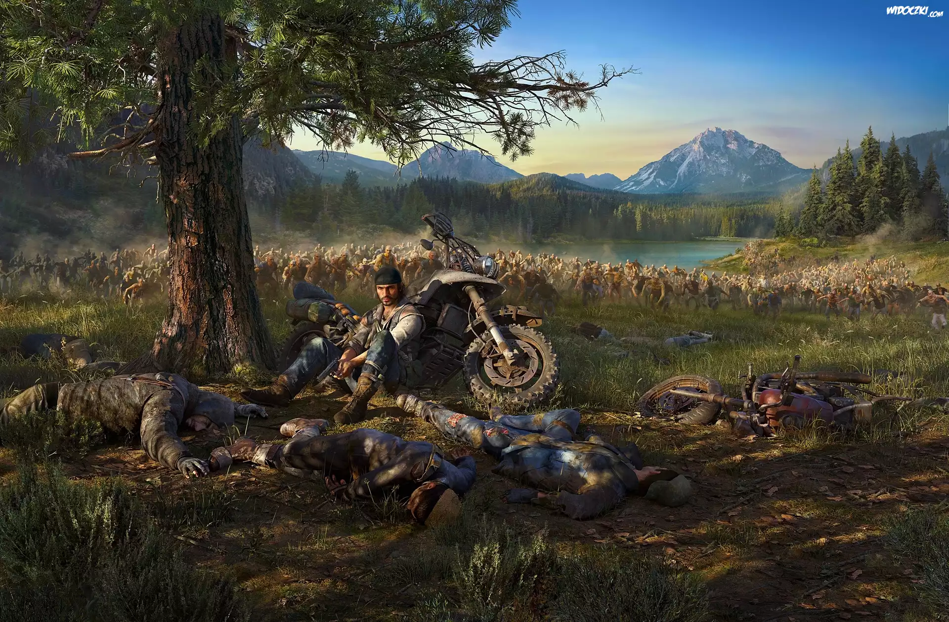 Gra, Days Gone, Postacie, Łowca nagród, Deacon St. John, Motocykl, Drzewo, Góry