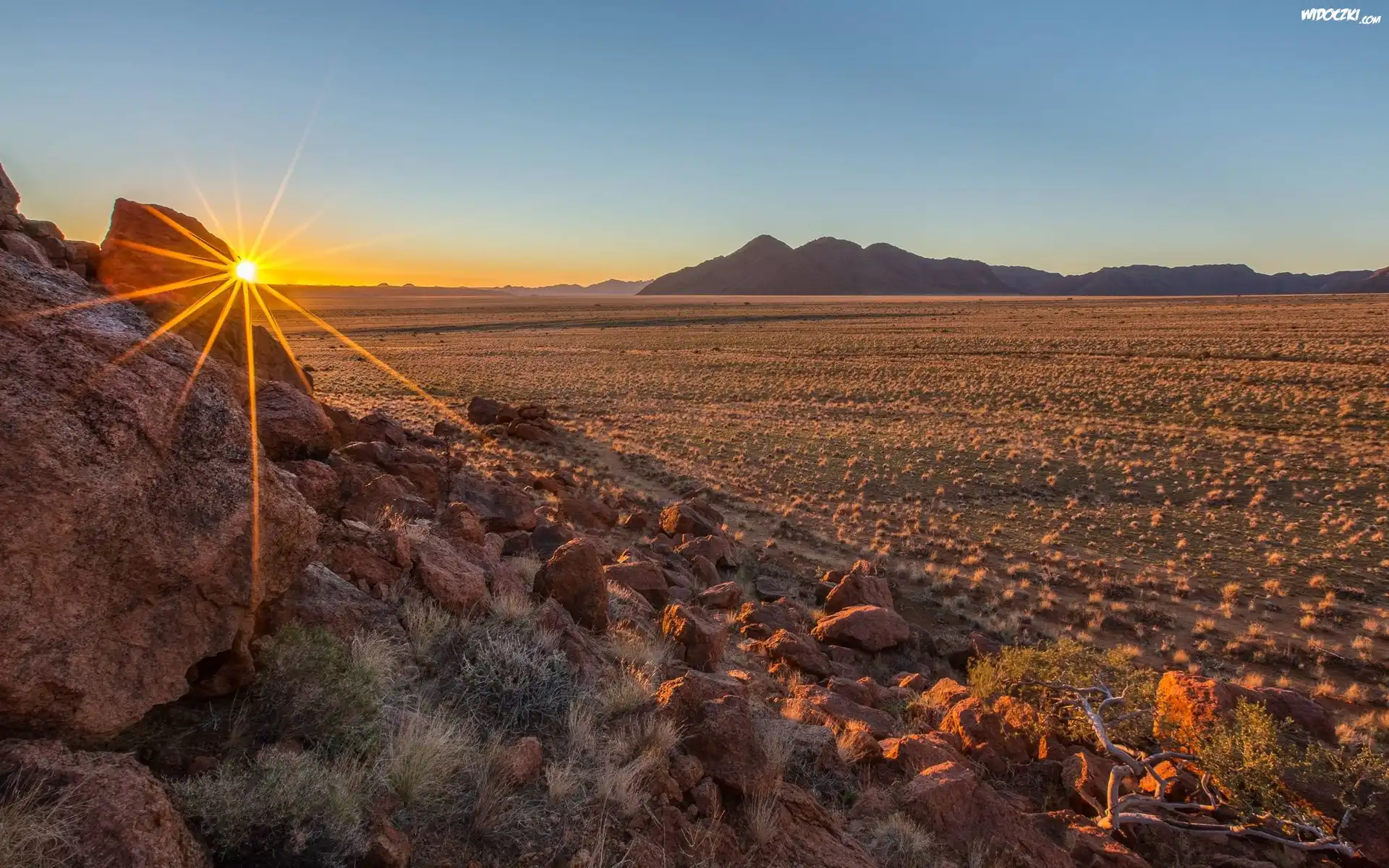 Nambia, Pustynia, Wzgórza, Wschód, Słońca, Kamienie