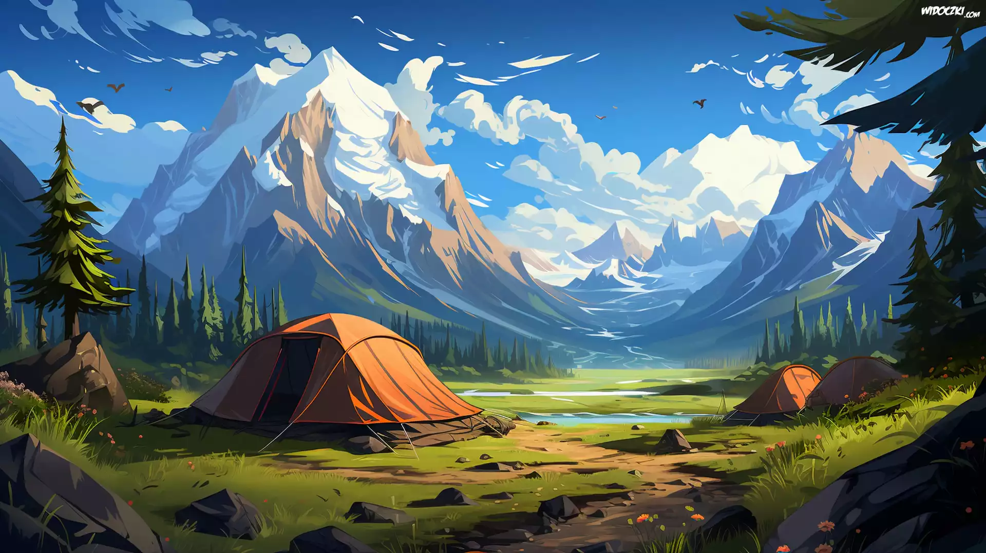 Góry, Las, Drzewa, Namioty, Dolina, 2D