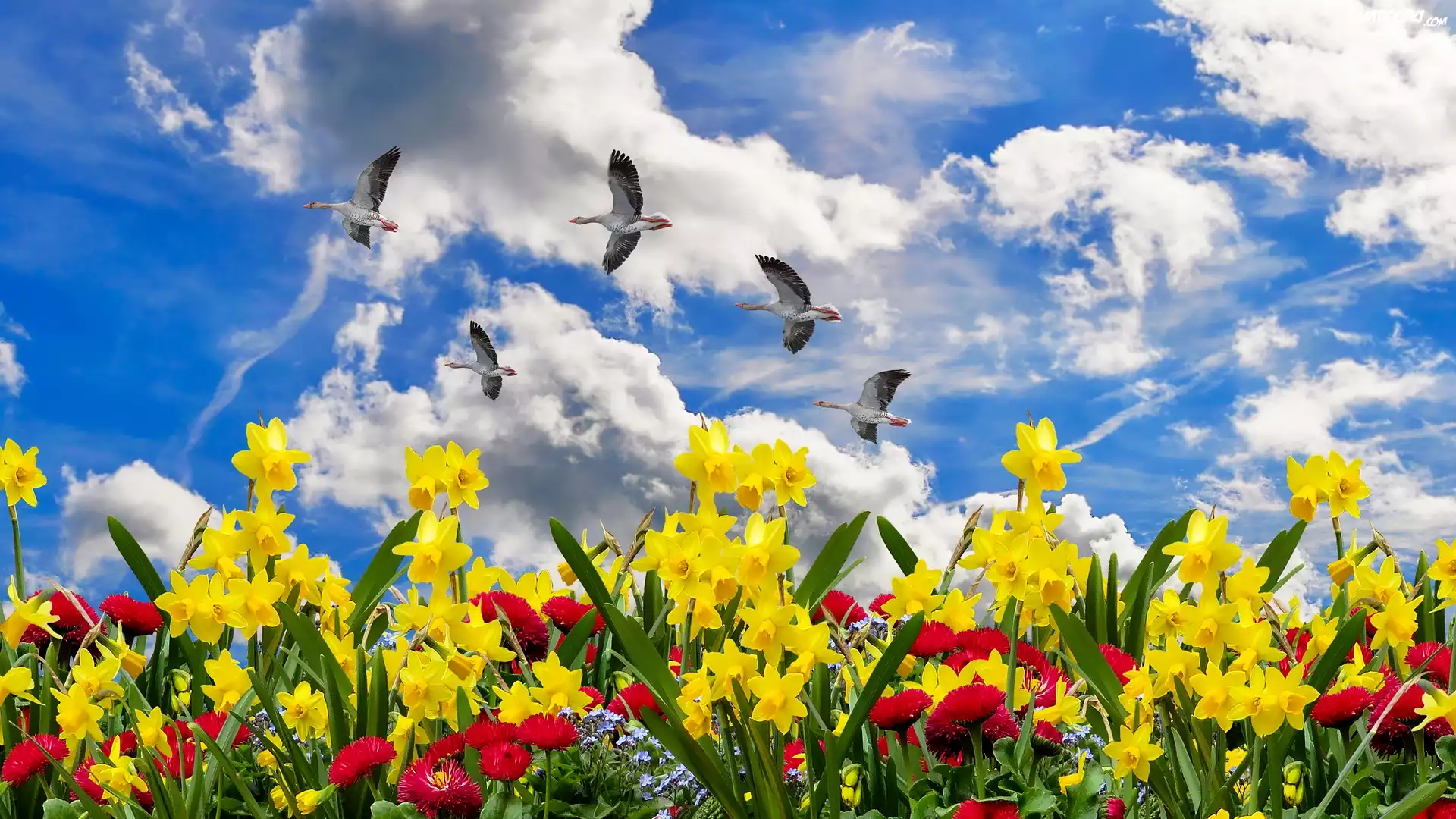 Zdjęcia, Wiosna, Kwiaty, Narcyzy żonkile, Ptaki, Gęsi, Niebo, Chmury Narcyz