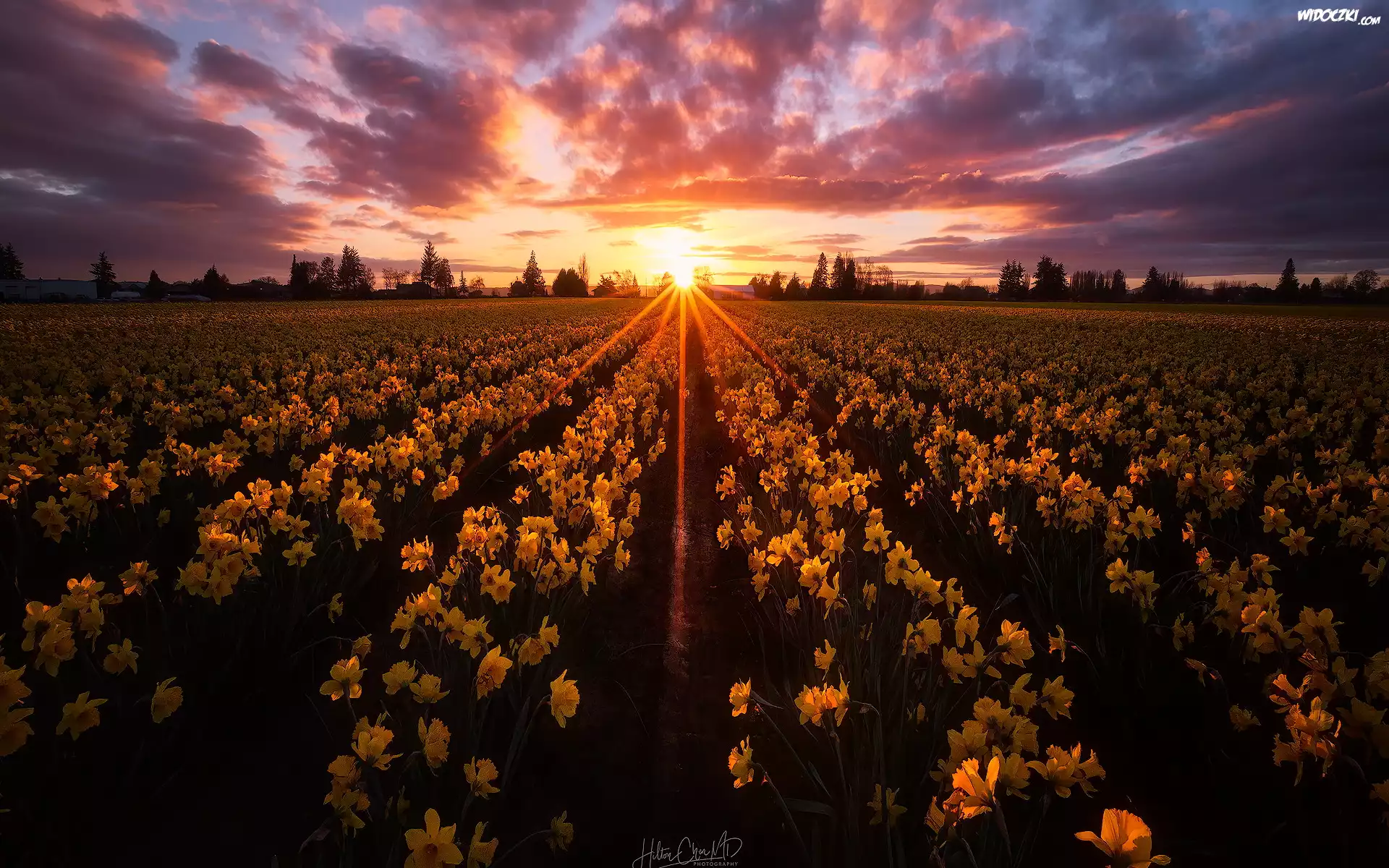 Zdjęcia, Pole, Narcyzy żonkile, Promienie słońca, Chmury, Zachód słońca